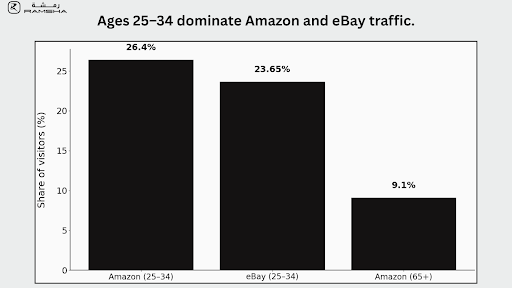 - In August 2025, people aged 25–34 accounted for 26.4% of Amazon visitors and 23.65% of eBay visitors, while only 9.1% of Amazon visitors were aged 65+.