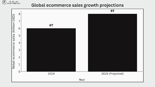 - Global ecommerce sales reached six trillion U.S. dollars in 2024 and are projected to grow 31% to nearly eight trillion dollars by 2028, confirming strong long-term momentum.