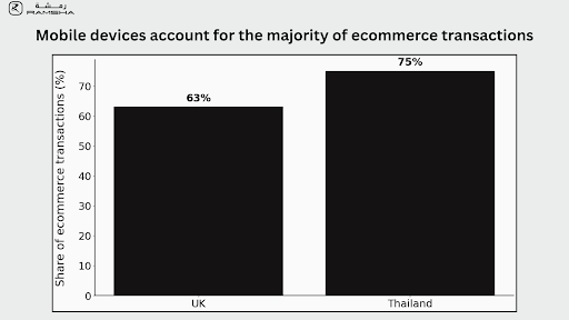 Mobile devices account for most e-commerce activity. In the UK, 63% of transactions happen on mobile, while in Thailand the share is 75%. Nearly 80% of retail website visits come from smartphones.