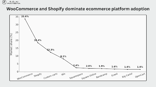 WooCommerce and Shopify dominate merchant adoption, together supporting more than half of all ecommerce stores.