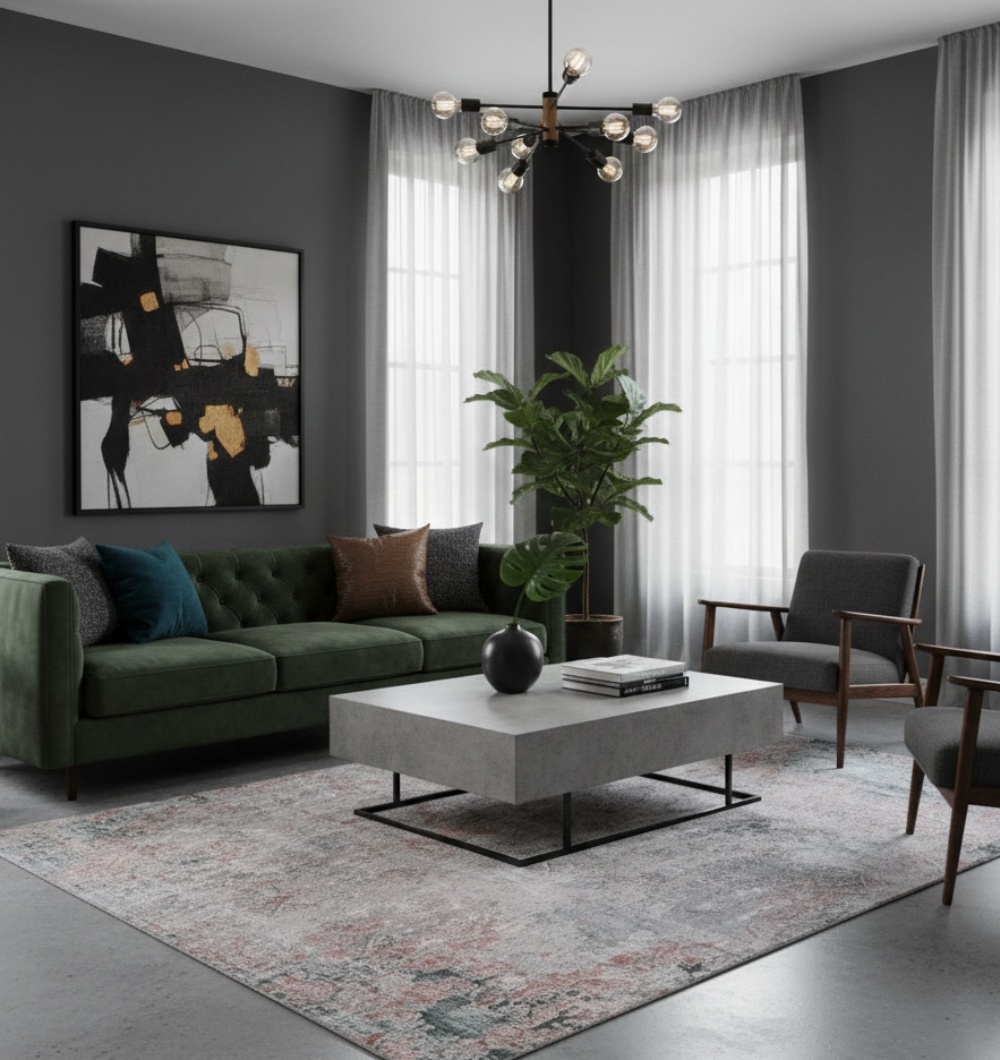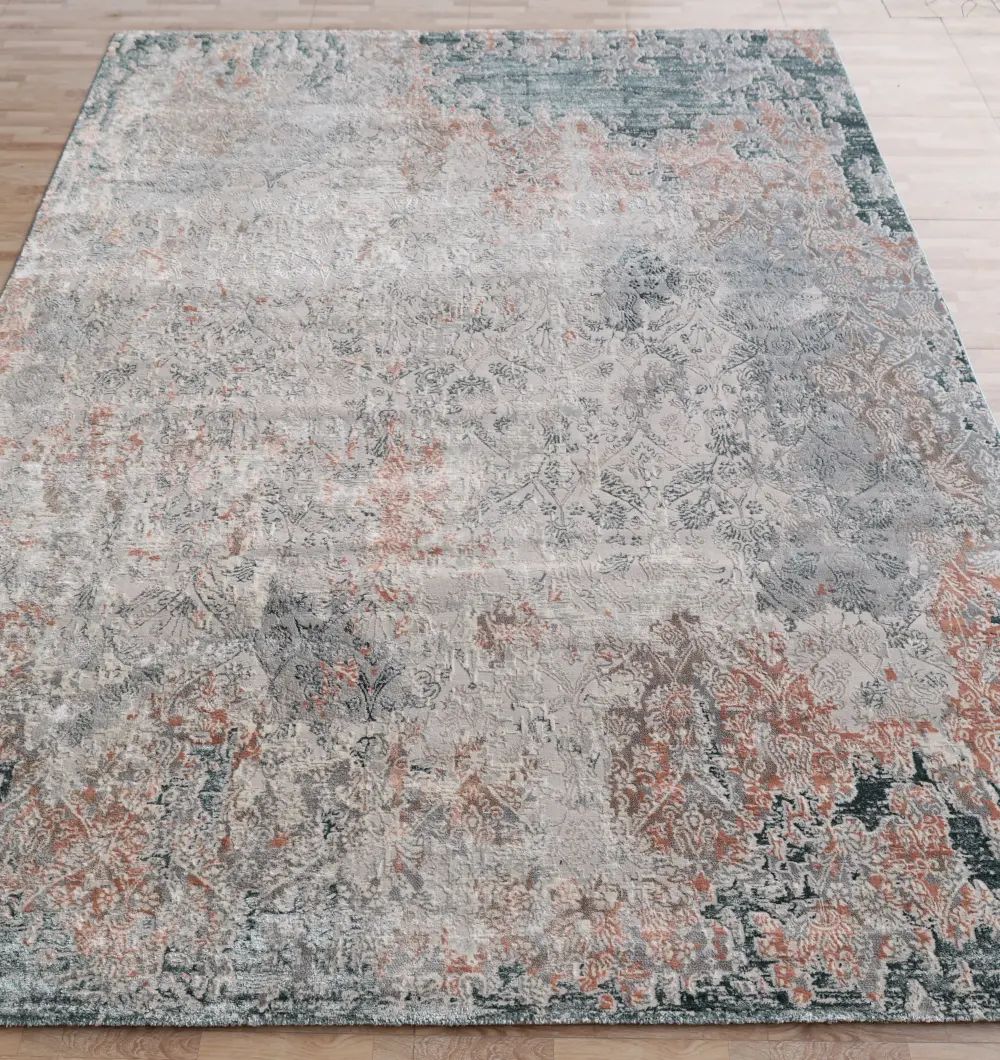 Soft blue tones blend with warm rust highlights to create a beautifully weathered abstract texture that enhances both modern and transitional interiors. Made from 100% polyester, the MMB-49 carpet offers durability, vibrant color retention, and a smooth underfoot feel. Its spacious 270?360 cm size is ideal for living rooms, lounges, and any area needing a bold statement piece with subtle elegance.