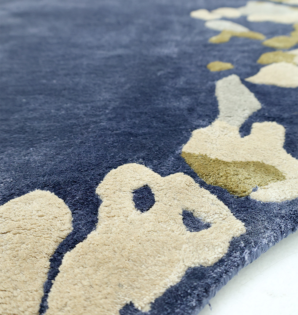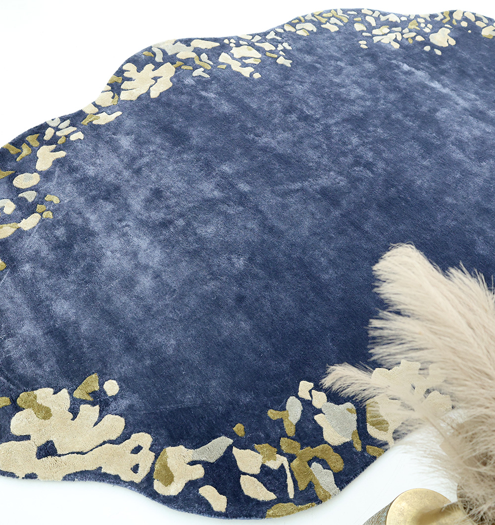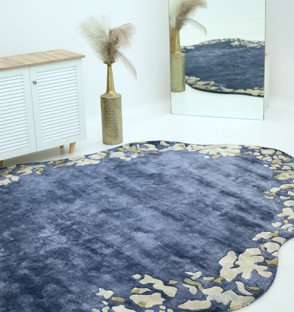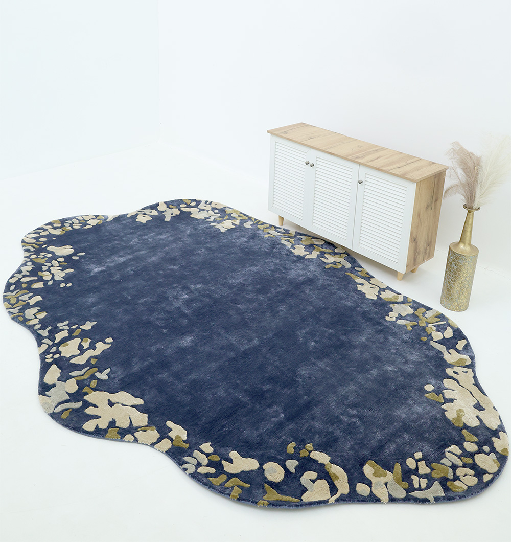 Its unique shaped design and rich navy blue base with subtle gold-toned accents make it a striking yet balanced statement piece. The 200×300 cm size is ideal for living rooms, bedrooms, lounges, or creative spaces where a touch of sophistication is needed without overpowering the décor.