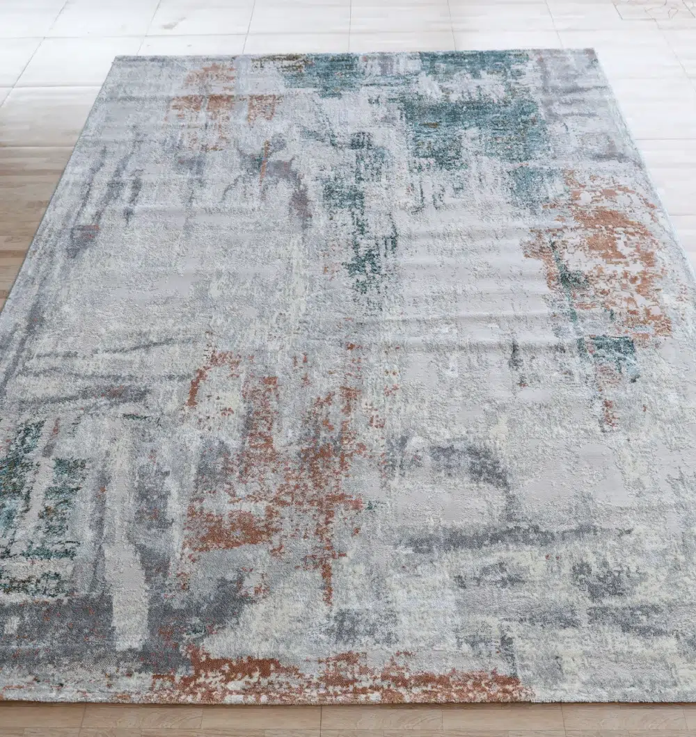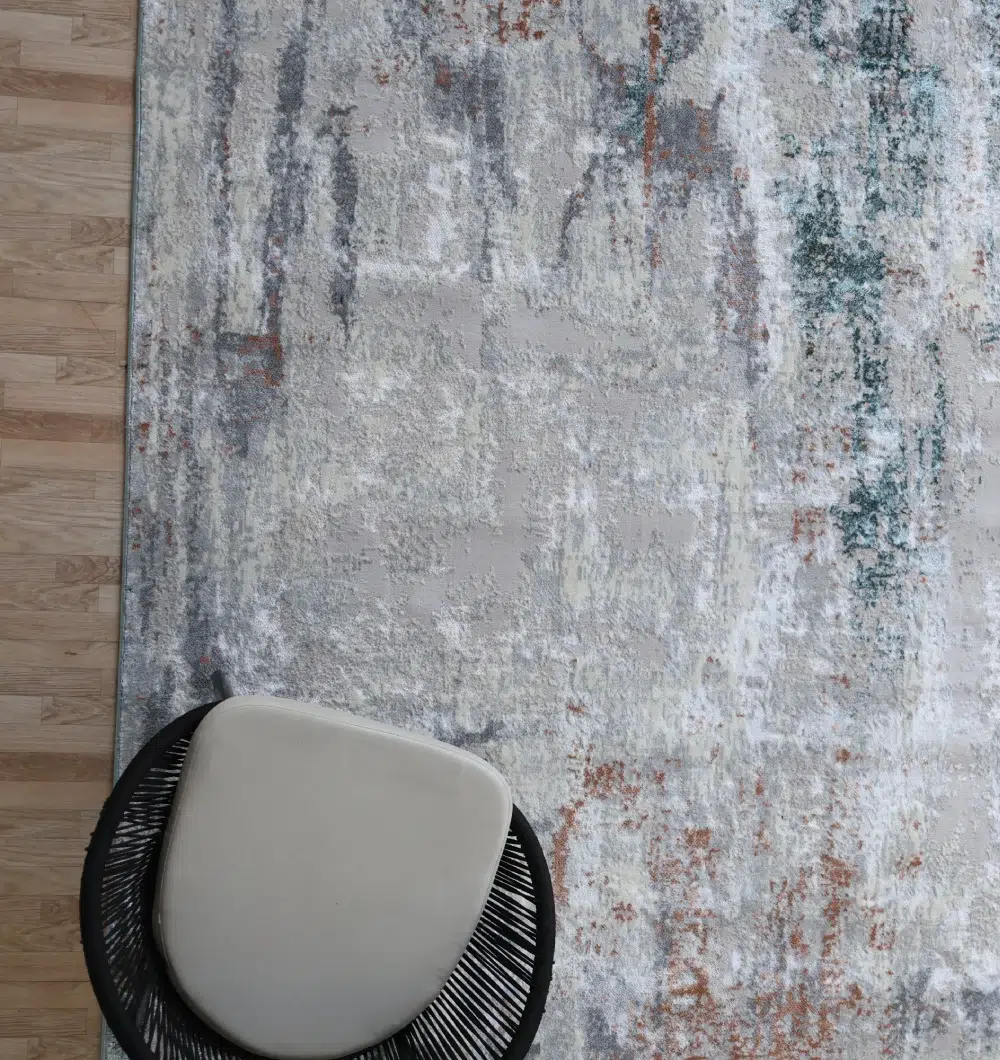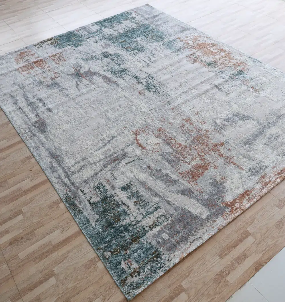 The MMB-51 machine-made carpet features a stunning abstract blend of grey, teal, and rustic copper tones, creating a modern artistic look perfect for contemporary interiors. Made from 100% polyester, it provides durability, softness, and easy maintenance. Its large 270?360 cm size makes it ideal for living rooms, bedrooms, and elegant lounge spaces seeking a stylish visual impact.
