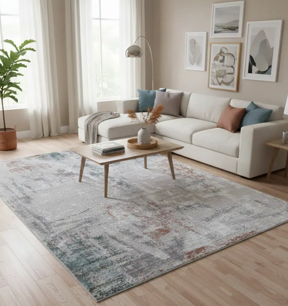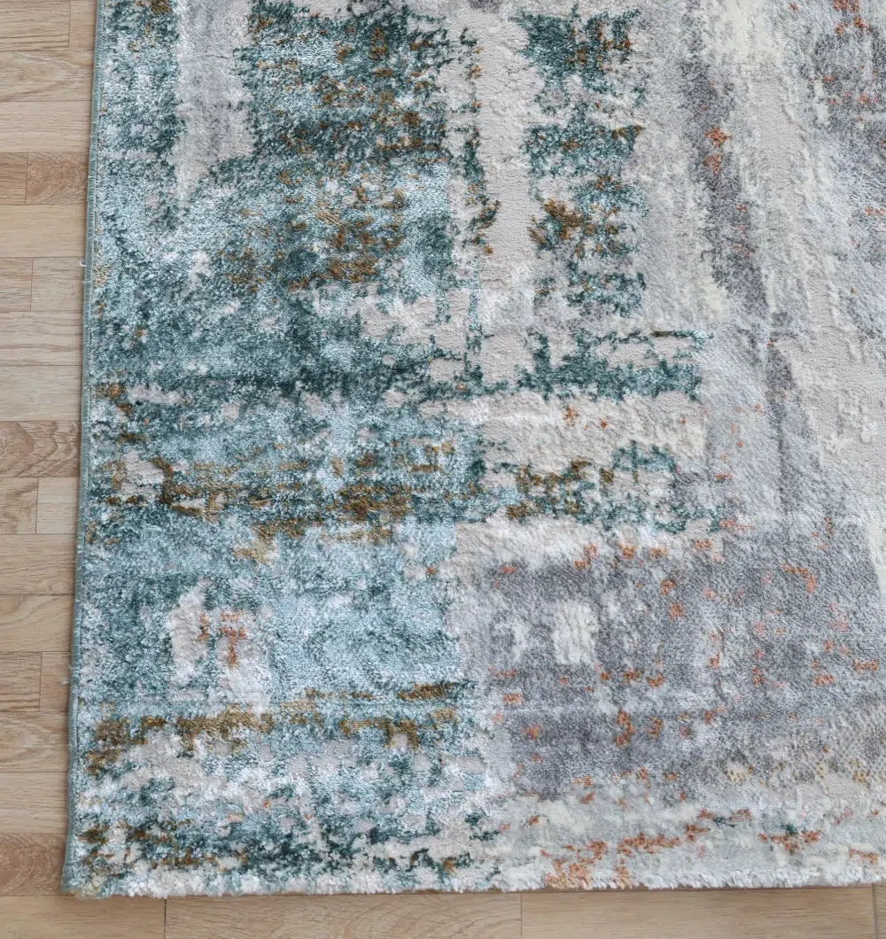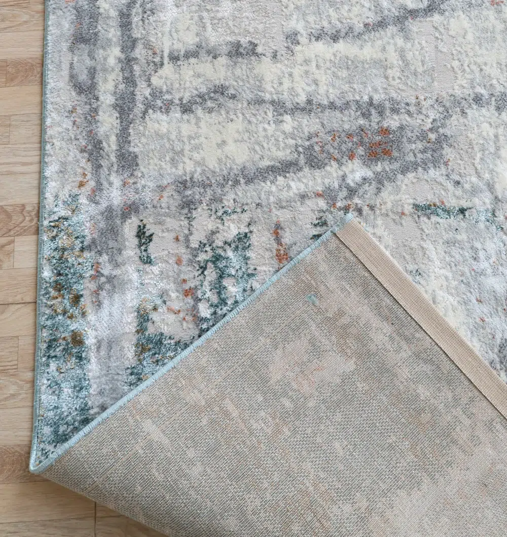 The MMB-51 machine-made carpet features a stunning abstract blend of grey, teal, and rustic copper tones, creating a modern artistic look perfect for contemporary interiors. Made from 100% polyester, it provides durability, softness, and easy maintenance. Its large 270?360 cm size makes it ideal for living rooms, bedrooms, and elegant lounge spaces seeking a stylish visual impact.