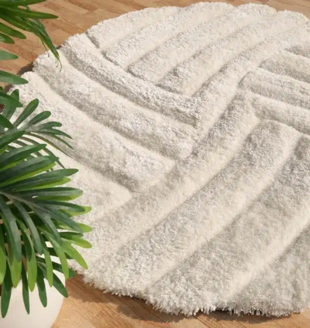 The MP3D 07 Plush Round Shaggy Rug is a sophisticated decor essential designed to bring softness and architectural depth to modern bedrooms or cozy reading nooks. This circular area rug, available in a generous diameter, features a striking carved pattern that adds visual interest to its pristine white surface. Expertly crafted from a high-quality blend of polyester and cotton, it boasts an extra-thick pile height for a luxuriously soft underfoot experience. This durable round rug provides a stable, non-slip feel while offering excellent sound dampening and thermal comfort. Its clean white palette and unique circular form make it an ideal choice for softening sharp lines in contemporary interiors, providing a cozy and elegant foundation for your home decor.