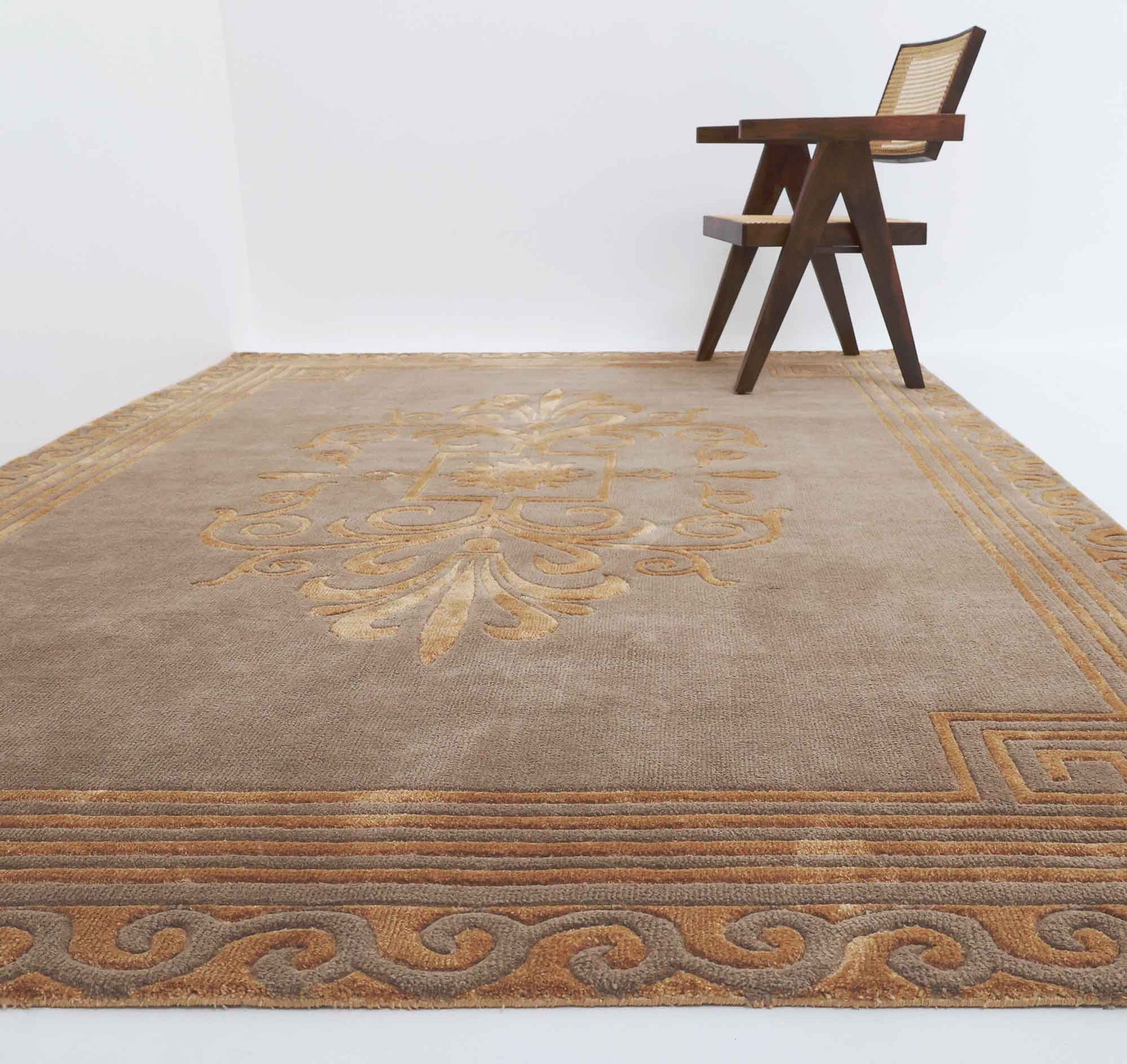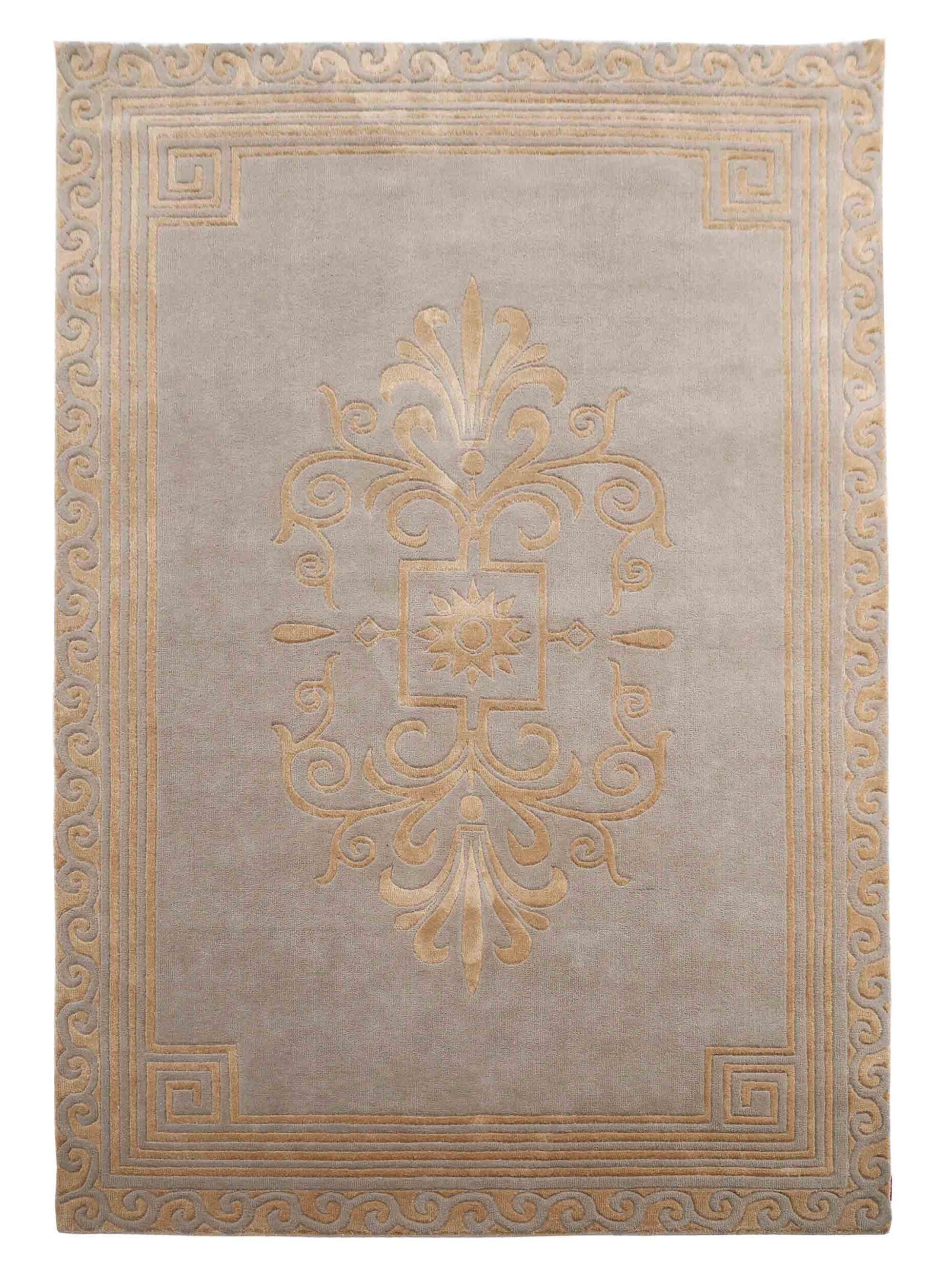 Soft grey-beige ground with golden tan scrollwork gives this rug a classic, framed look with a decorative center medallion and border. The tone-on-tone detailing feels elegant without being loud, so it pairs well with both modern and traditional furniture. Machine-made from polyester with cotton, it has a smooth feel, lays flat, and is easy to maintain for everyday use. Place it under a sofa set to create a finished layout, or use it in a bedroom for a calm, refined base. This classic medallion rug works as a neutral border rug and stays practical as a machine-made rug.
