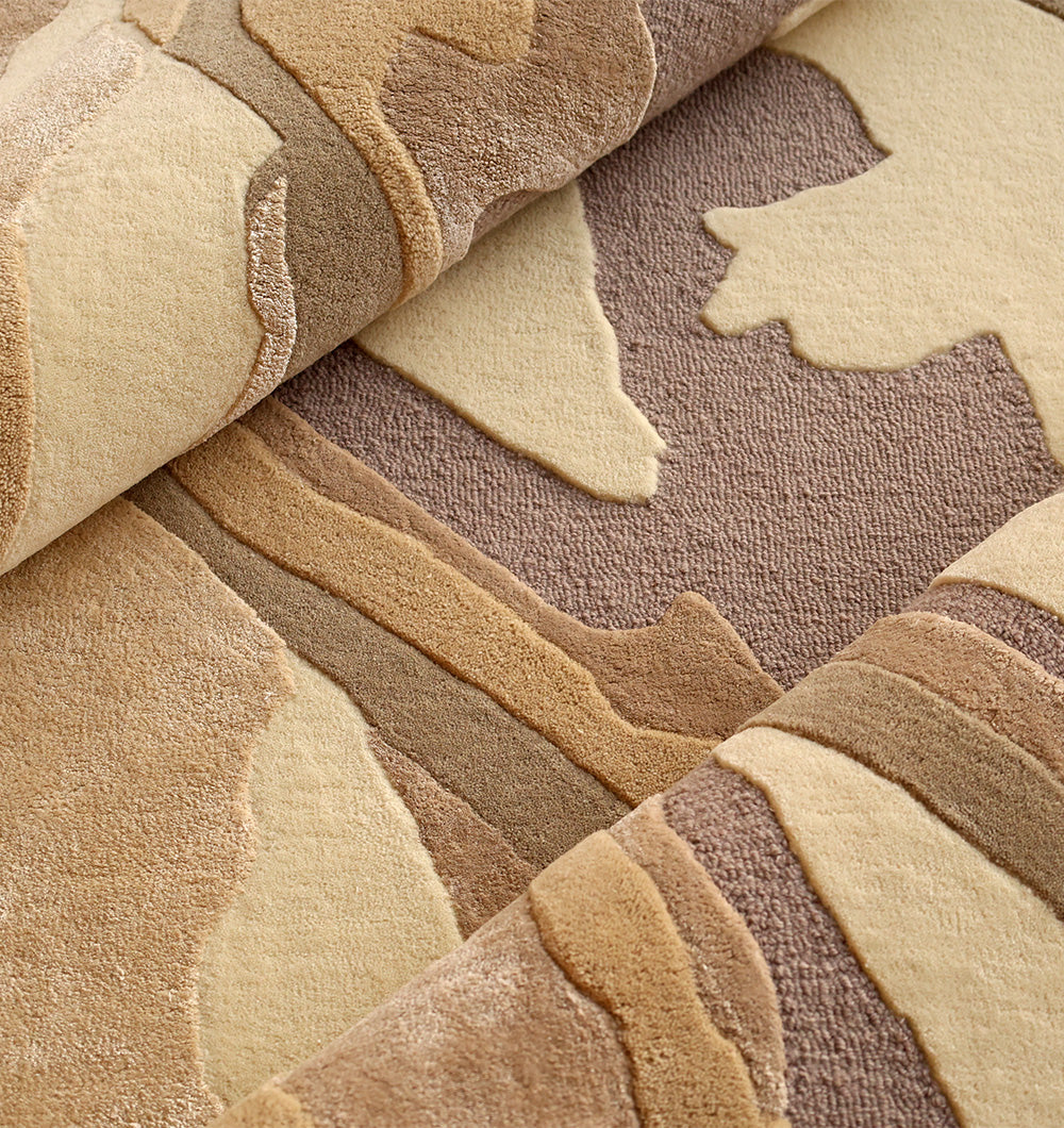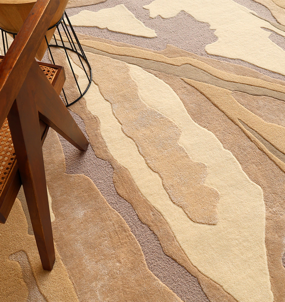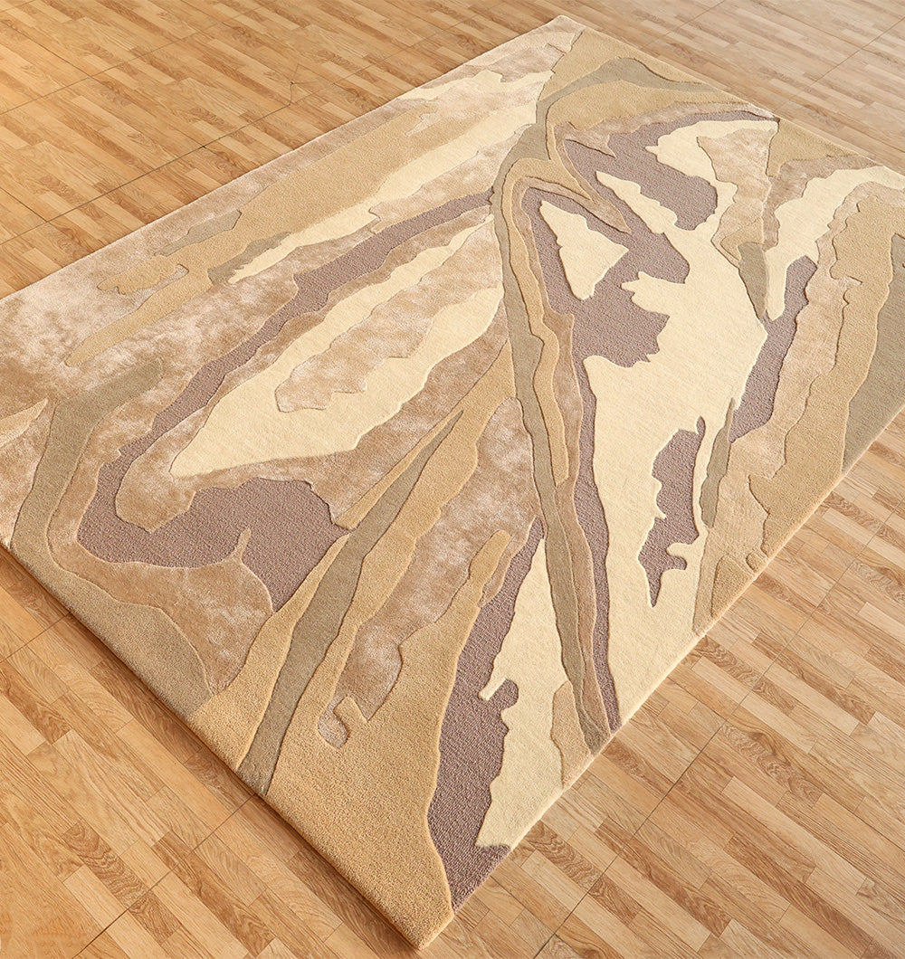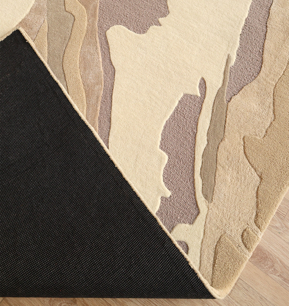 Earthy layers give this rectangular rug a bold, natural look that still stays neutral. Swaths of taupe, sand, warm beige, and cream are broken up with muted grey-lavender sections, creating a flowing, stone-like pattern. Handtufted for a soft, supportive feel, the wool, viscose, and cotton blend adds warmth plus a slight sheen that highlights the different shapes. Use it as a neutral abstract rug to add movement without bright color, or anchor seating with a hand tufted wool rug that feels cozy underfoot. The layered design also makes it a strong taupe area rug option for modern spaces.