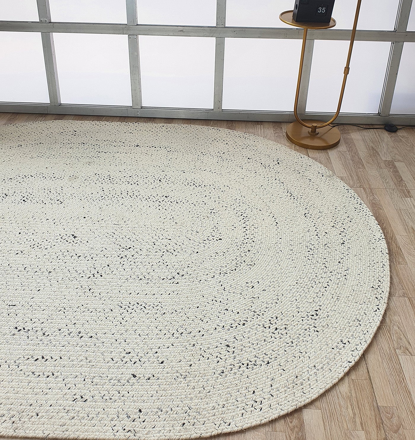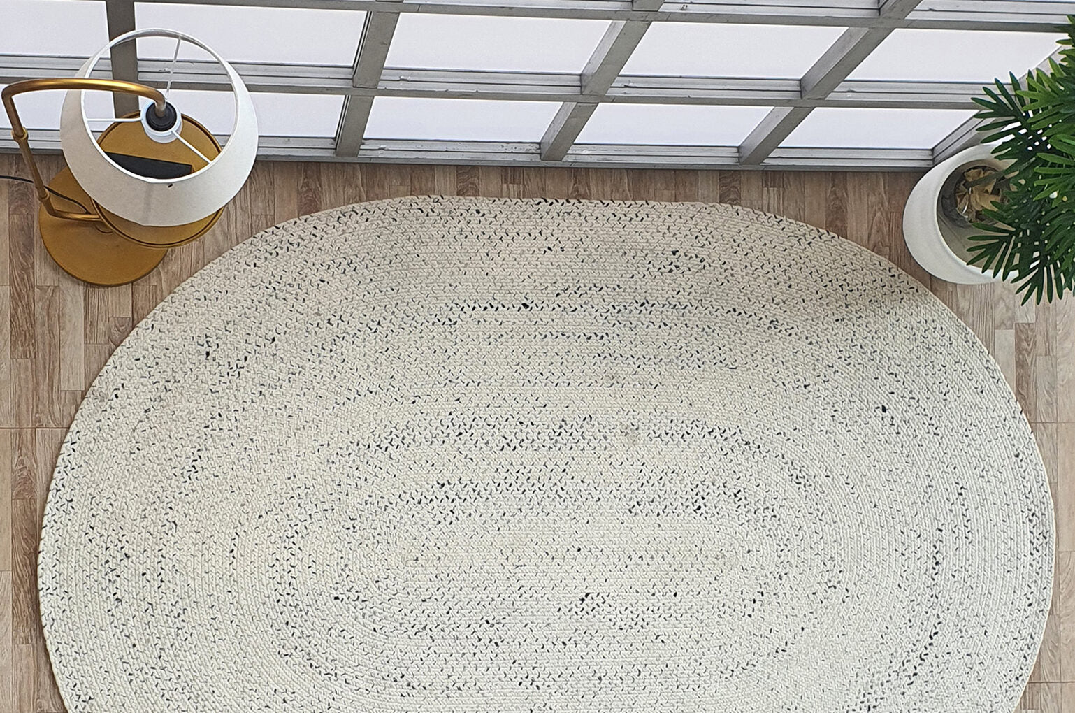Soft curves and subtle texture define this oval rug. The creamy off-white base is detailed with small black flecks that add depth without overpowering the space. Crafted from natural wool blended with chocho, it feels warm and comfortable underfoot while offering everyday durability. The braided construction creates a structured surface with visible circular lines that enhance its shape and character. This oval braided rug works well in open areas where you want a gentle contrast against wooden floors. Its neutral tones make it easy to style in modern and minimal interiors. A practical and stylish wool braided rug, it also serves as a versatile neutral area rug for relaxed and balanced spaces.