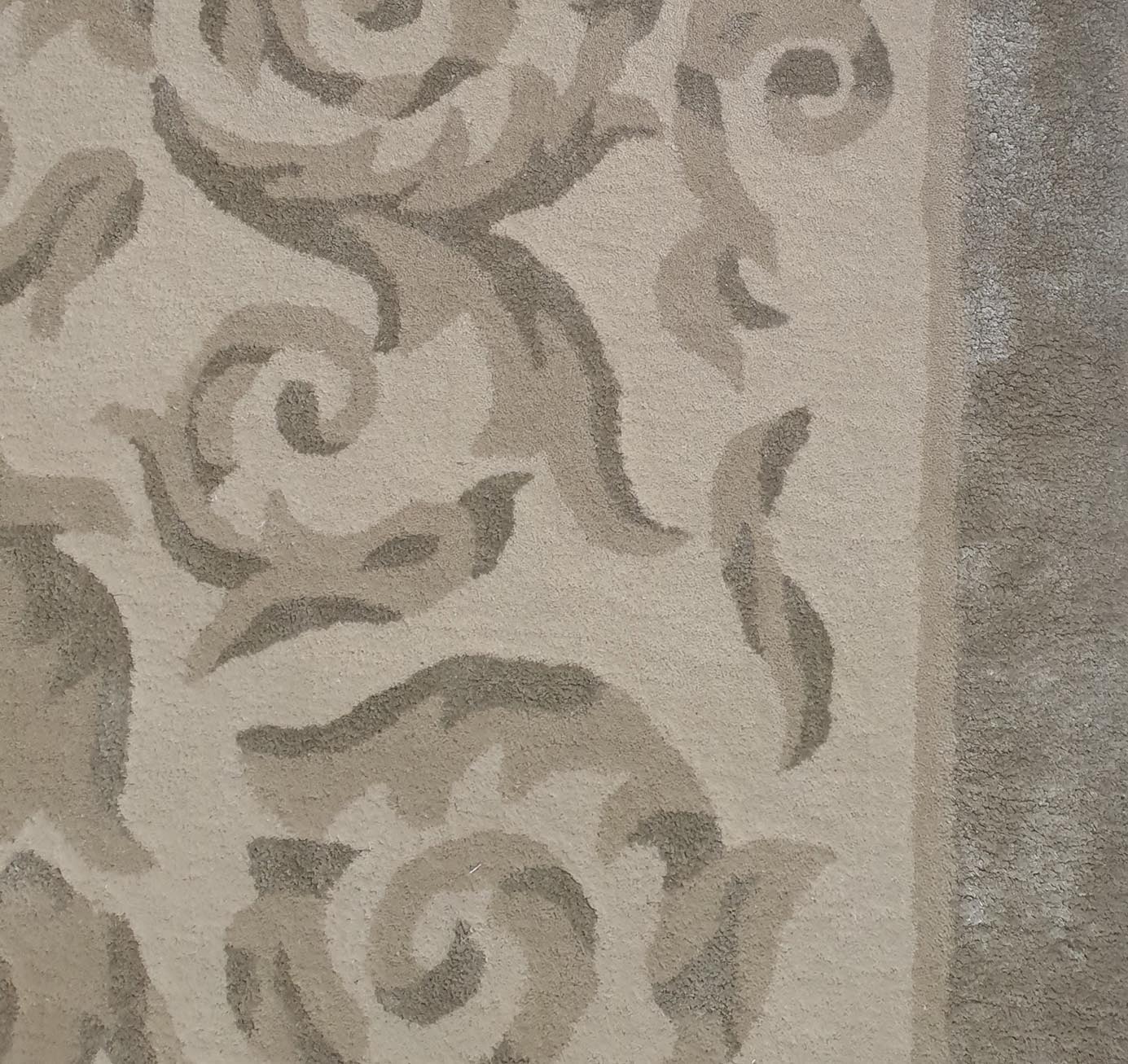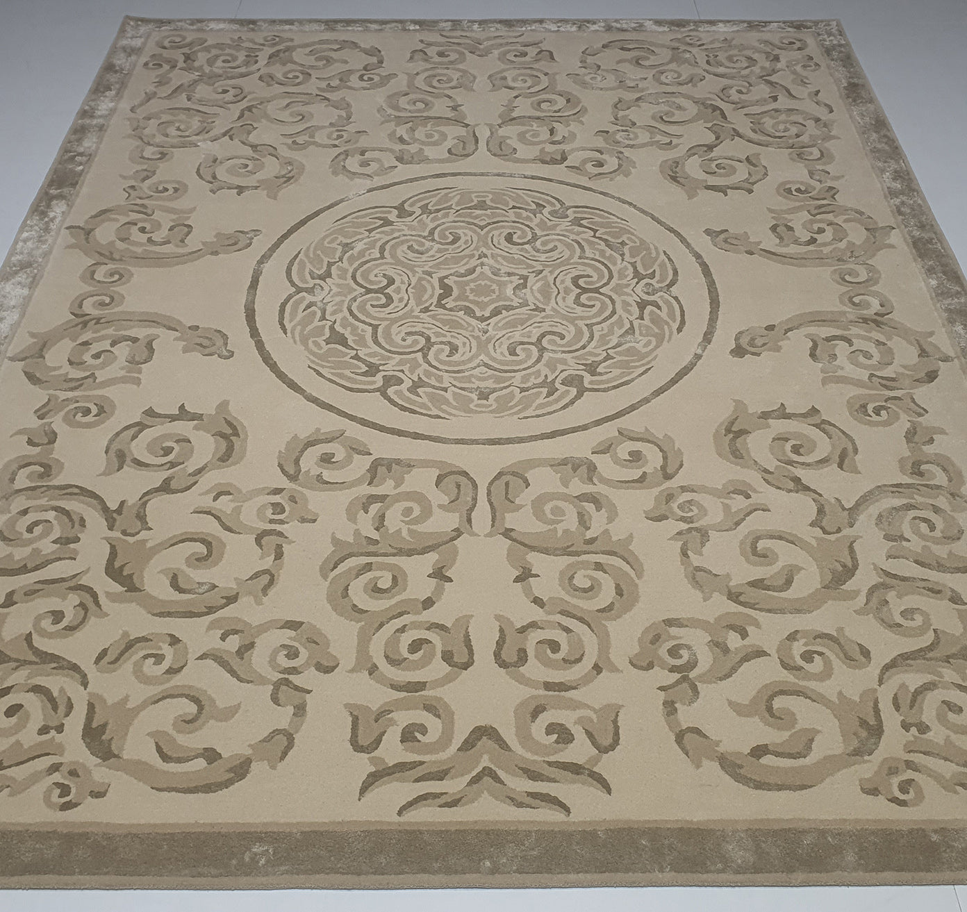 With ornate scrollwork and a detailed center medallion, this rectangular rug brings a refined, classic look in soft beige, dove grey, and charcoal accents. The raised pattern adds depth and a gentle sheen, while the border frames the design neatly for a finished feel. Made as a handtufted rug using wool, viscose, and cotton, it offers a comfortable, cushioned surface with clear texture. Use it to ground a seating area or add structure to a calm, neutral space. This traditional medallion rug pairs well with wood, metal, and upholstered furniture, and the balanced tones make it an easy grey area rug for everyday styling.