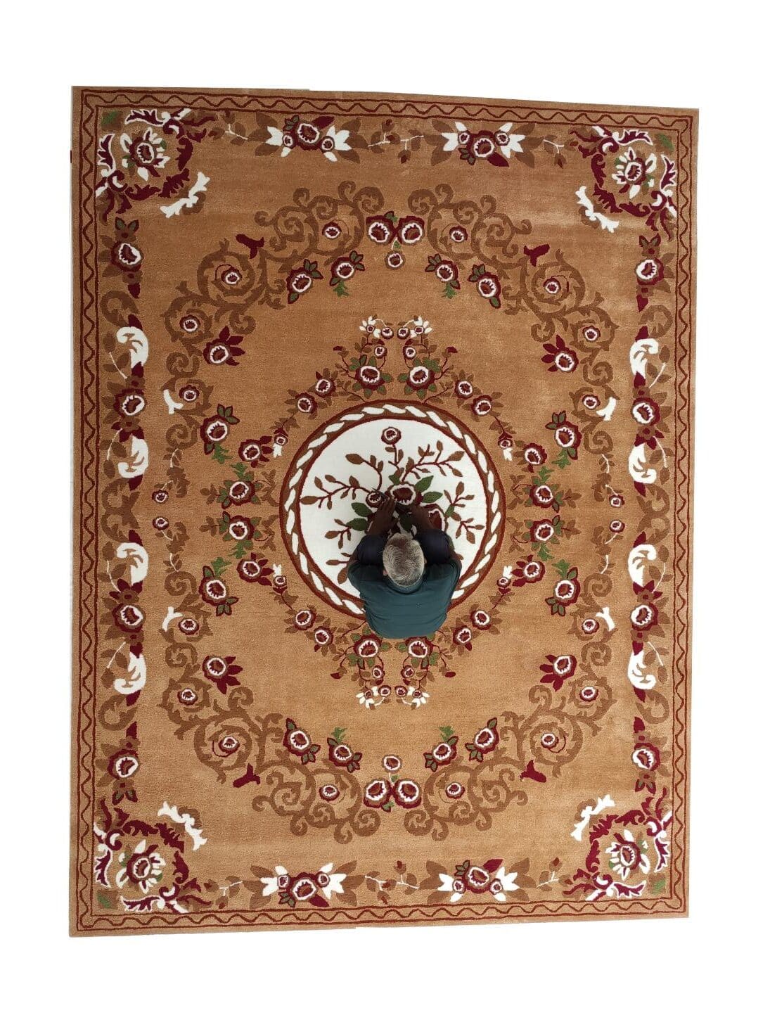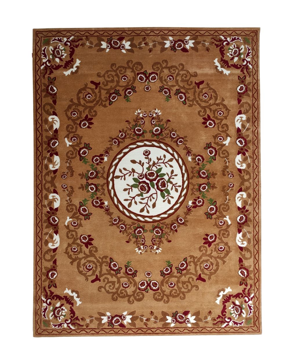 Rich caramel brown sets the base for this elegant rectangular design, detailed with a floral center medallion and scrolling borders in red, cream, and soft green. The balanced layout gives it a formal yet welcoming feel, making it easy to place in classic interiors. Crafted as a handtufted rug from polyester and cotton, it offers a smooth surface with clear pattern definition and practical durability. The structured border frames furniture neatly, while the warm tones add depth without darkening the room. This traditional floral rug works well as a focal point under a seating set, and the detailed layout makes it a timeless medallion area rug for refined spaces.