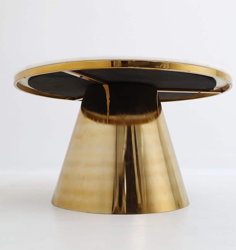 Make a statement centerpiece with this round coffee table in gold. The white top has a smooth, stone-look finish, paired with a wide gold pedestal base that feels stable and modern. Clean lines and a low profile make it easy to style with books, a tray, or simple décor without clutter. Made from 100% aluminium, this gold coffee table is a practical choice for everyday living.