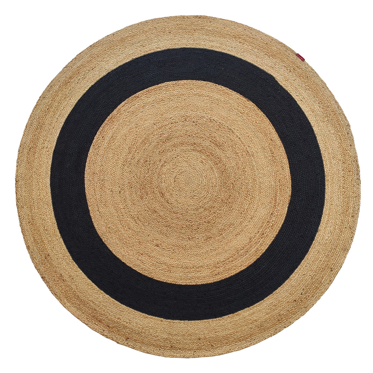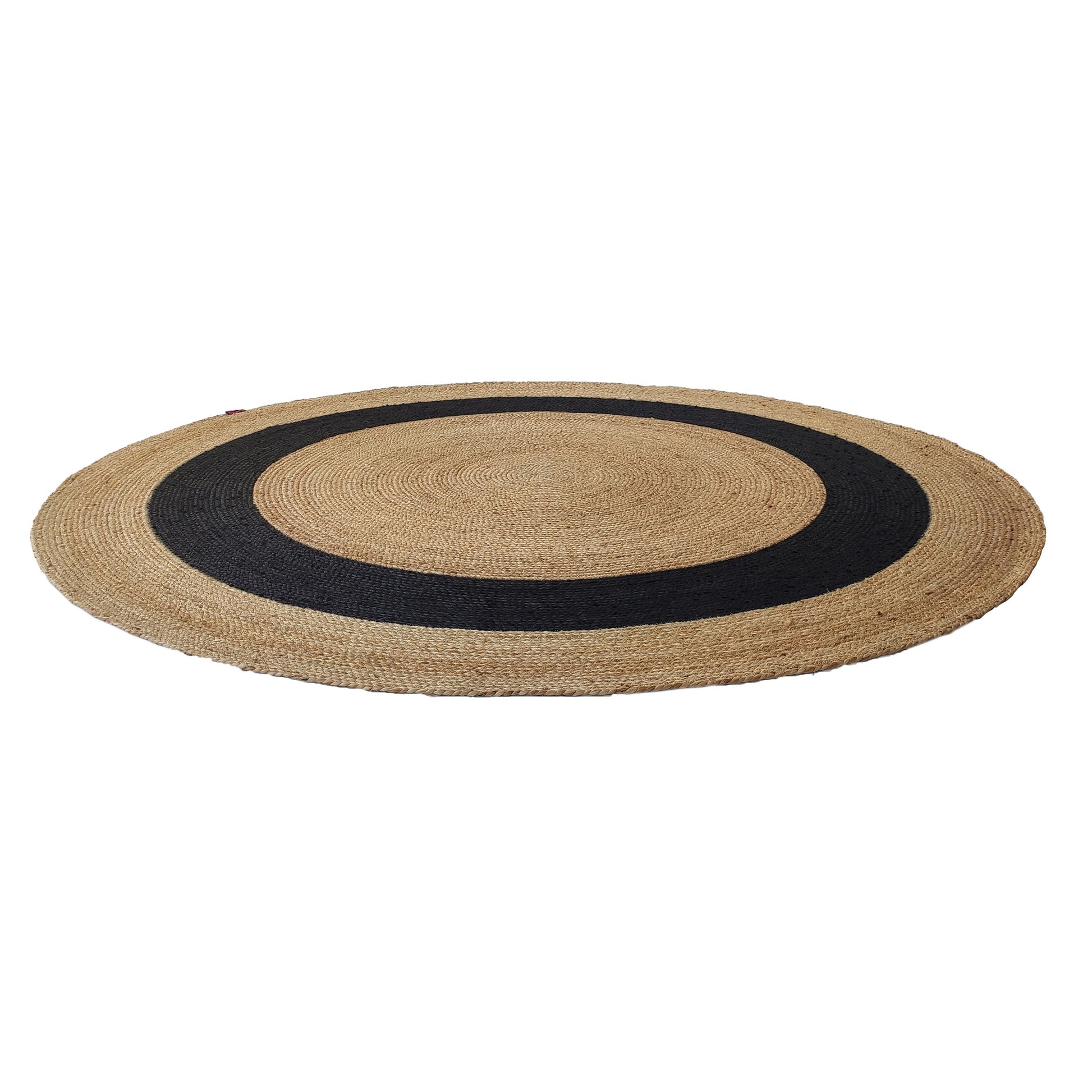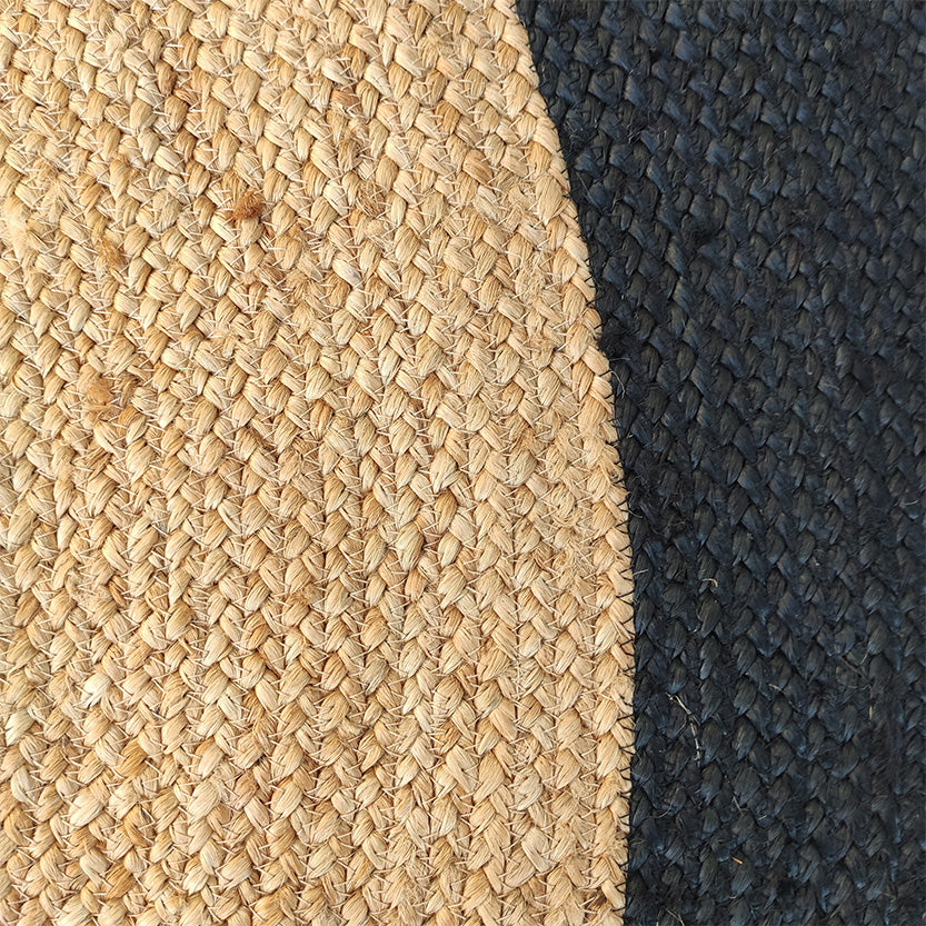 A clean circular layout makes this design simple yet striking. Crafted from pure jute, it shows warm natural beige with a bold black ring around the center, creating clear contrast without overpowering the space. The tight weave and braided build give this round jute rug a firm surface that handles daily movement with ease. Its centered pattern adds balance under coffee tables or reading chairs. The texture of this braided jute rug brings depth while keeping a natural look. For modern or minimal interiors, this black and natural jute rug offers a strong focal point with earthy character.