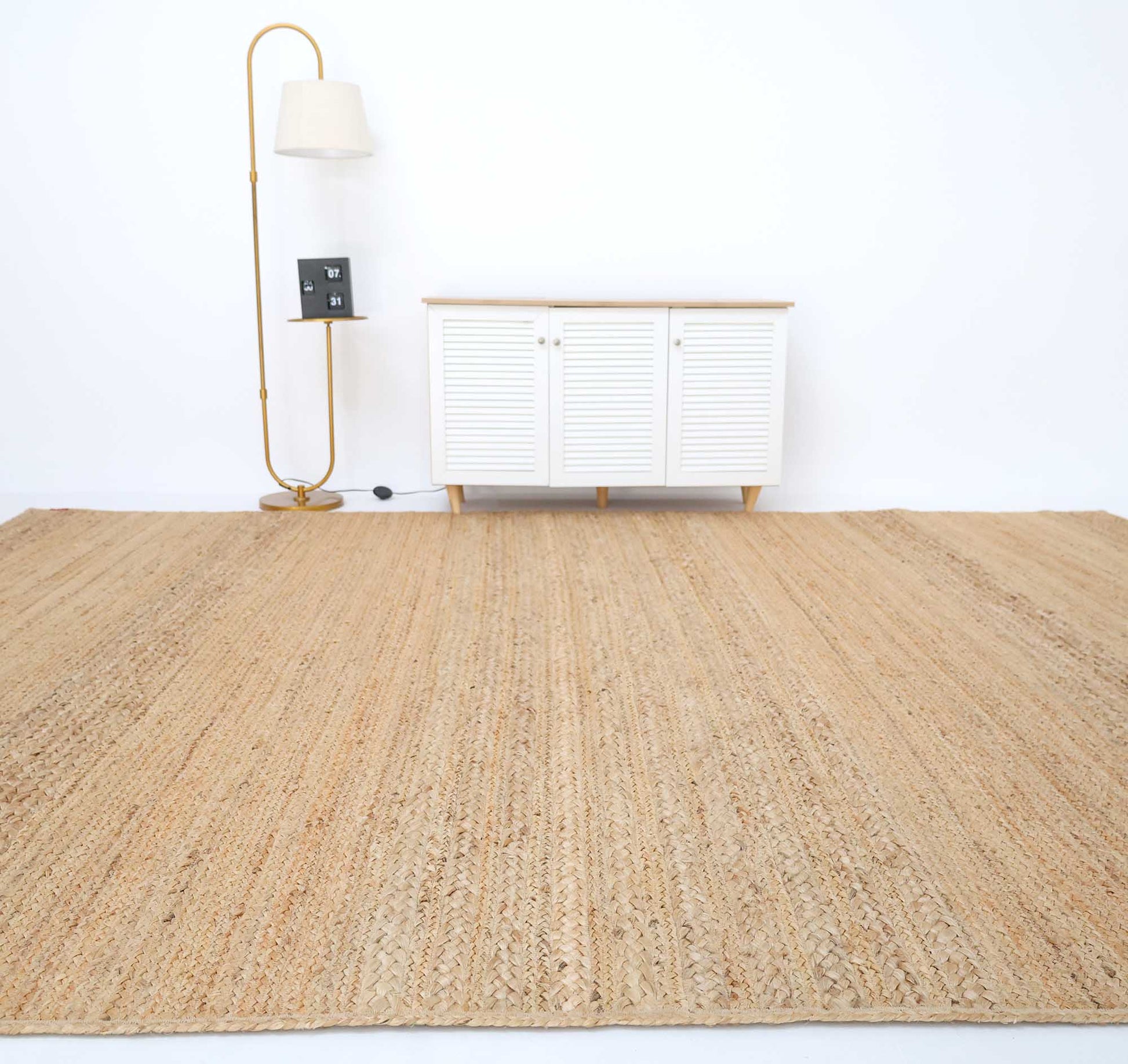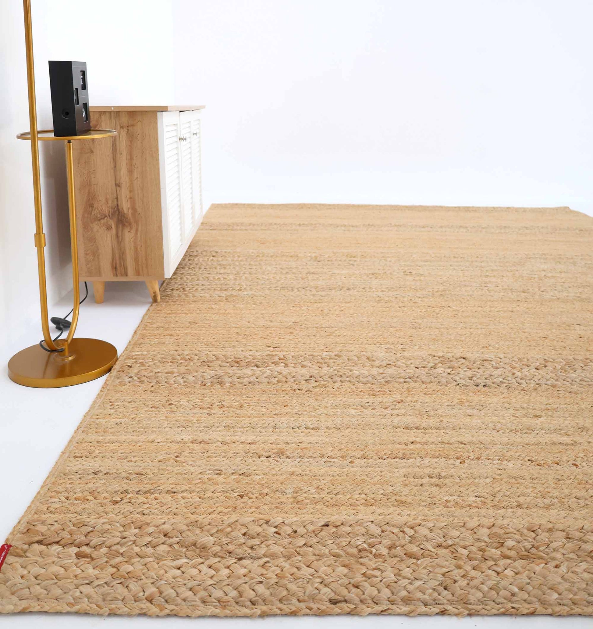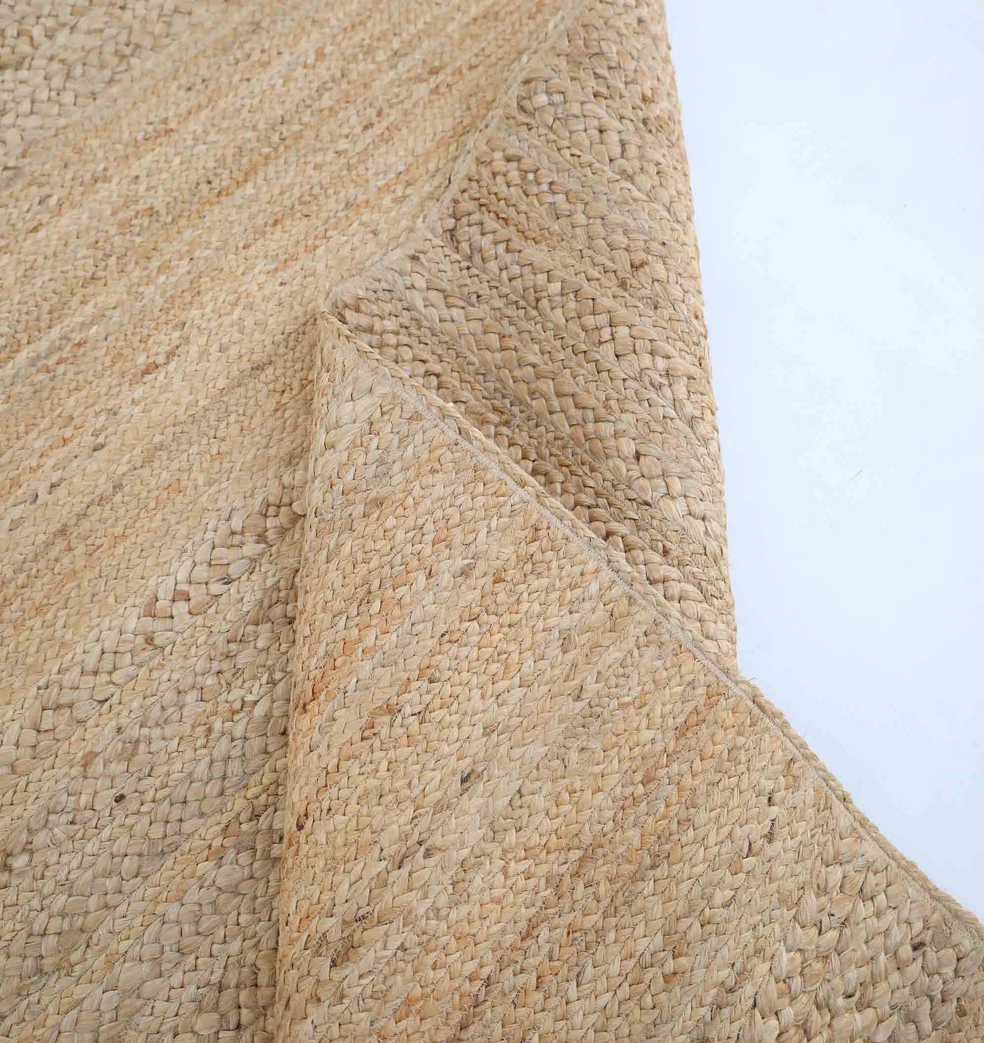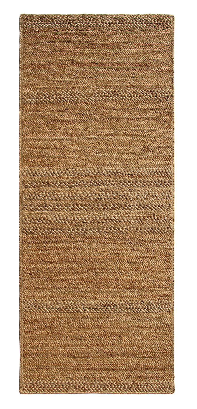 Subtle texture and layered bands give this rug a calm and grounded presence. Made from pure jute, it features soft beige and light tan tones with visible natural variations across the surface. The horizontal braided detailing adds depth while keeping the overall design simple and versatile. Its firm weave offers durability for everyday use, making this rectangular jute rug a practical addition to busy spaces. The structured build ensures this braided jute rug maintains its shape while enhancing the organic feel of the room. If you prefer neutral and earthy decor, this natural jute rug provides a warm base without bold patterns.