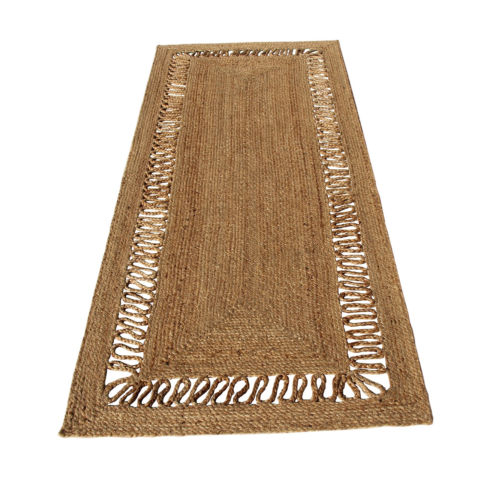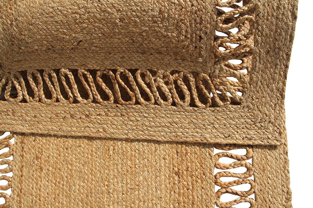 A textured border with open loop detailing gives this rug a distinctive handcrafted look. Made from pure jute, it features a warm golden beige tone that highlights the natural character of the fiber. The solid woven center keeps the design balanced, while the braided edge frame adds depth and structure. This rectangular jute rug works well to define seating areas or place under a console for a clean, grounded base. The firm construction makes it a reliable braided jute rug suited for everyday use. If you prefer natural decor with subtle detail, this border jute rug brings texture and warmth without heavy patterns.