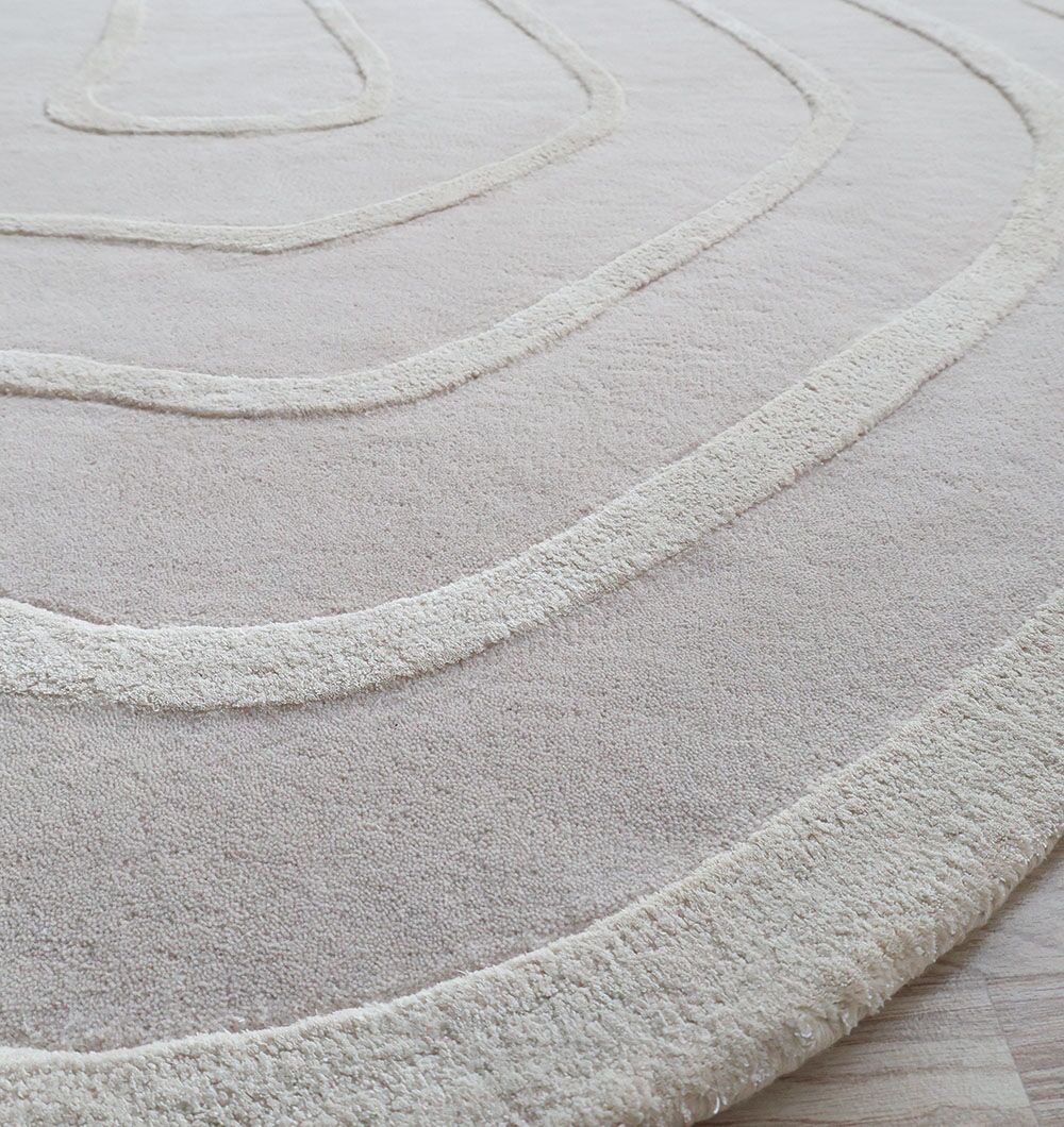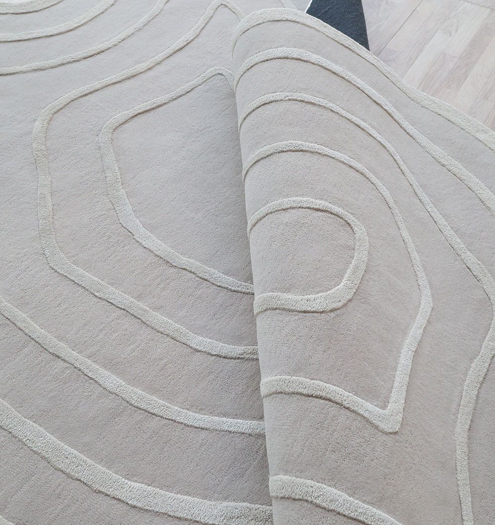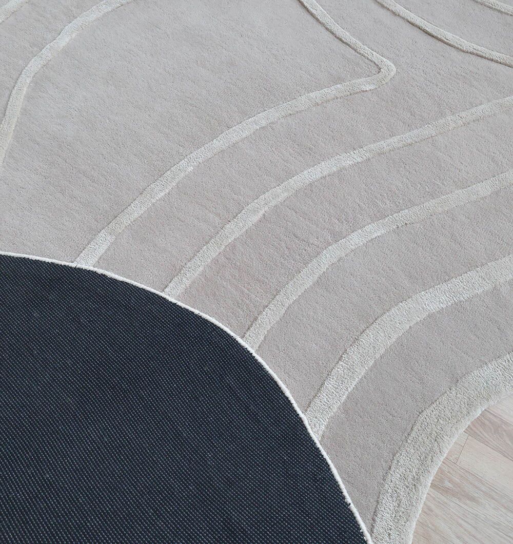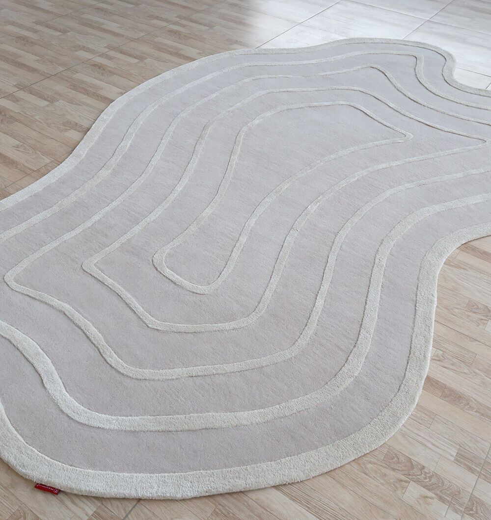Muted dove grey and soft ivory lines create a layered contour look on this irregular rug, adding movement without a loud pattern. The hand-tufted pile feels smooth and comfortable, and the tencel, wool, and cotton blend gives a gentle sheen that looks best in natural light. Use it as a hand tufted rug to soften straight furniture layouts, choose a tencel wool blend rug when you want a silky touch with everyday comfort, or style a grey contour rug to keep the space calm while adding texture.