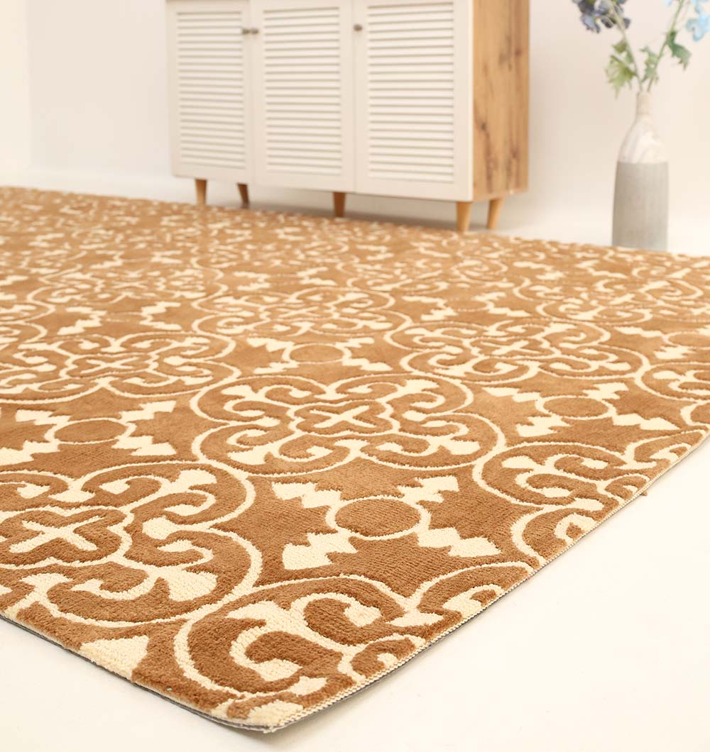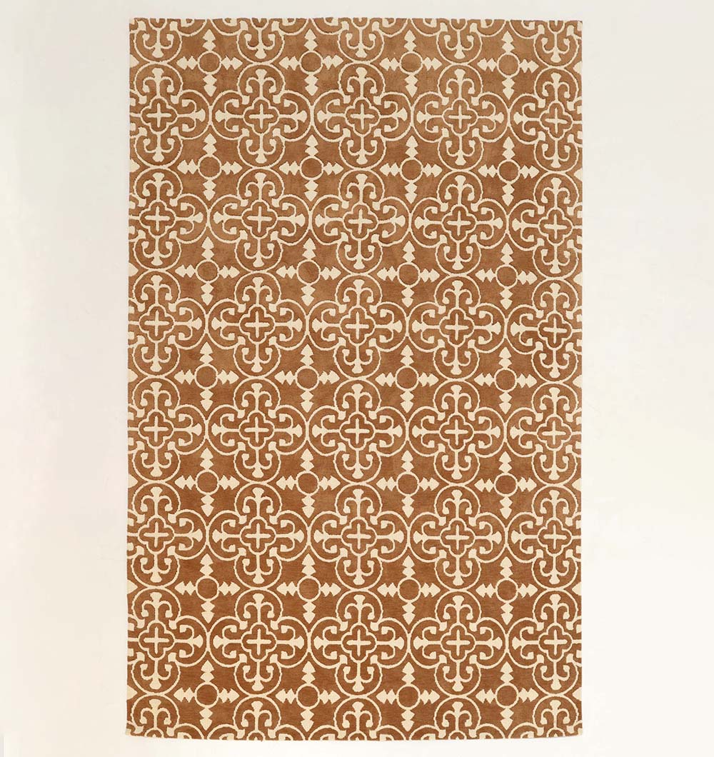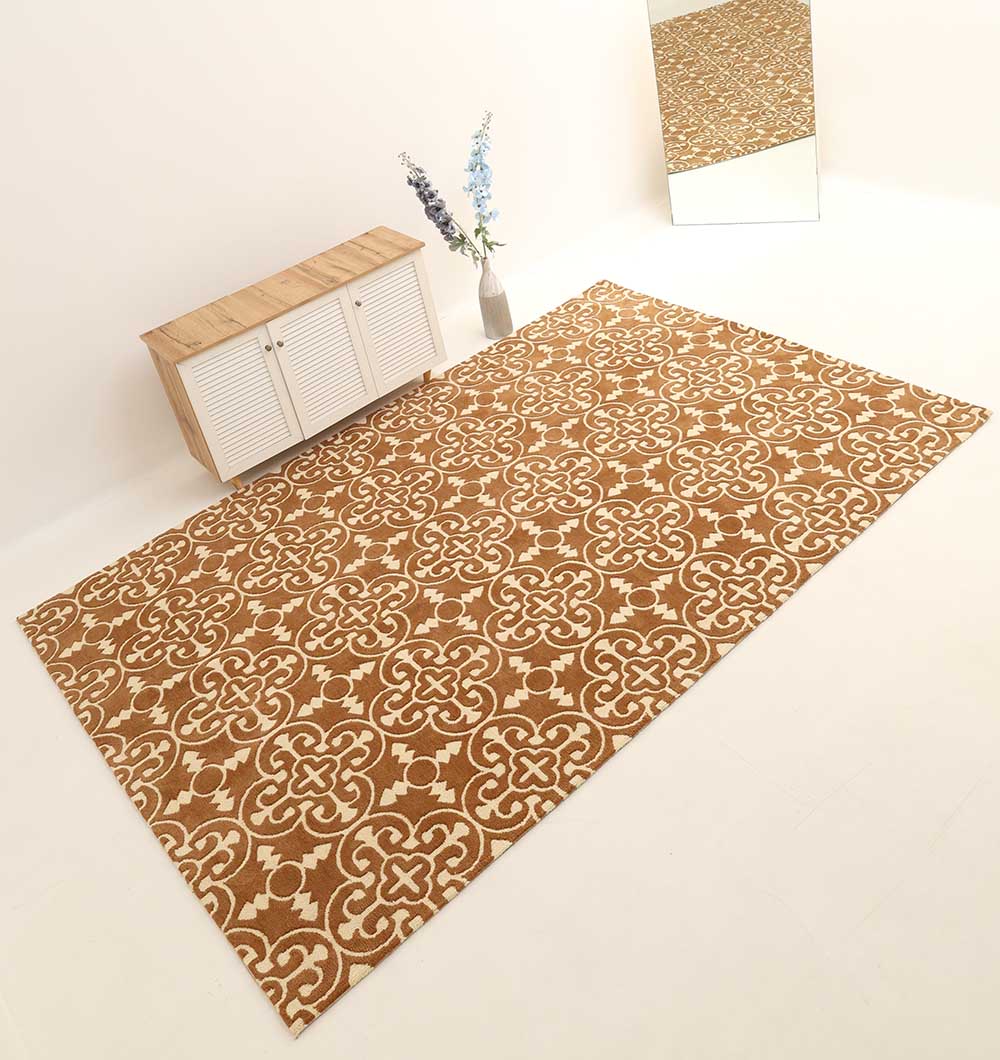 Warm caramel brown with an ivory trellis motif gives this rectangle rug a classic look that still feels clean and modern. The repeating pattern adds structure to a space and helps hide daily wear, making it a practical choice for busy areas. As a machine-made rug, it has a smooth, even finish and a polyester blend that’s easy to live with. Style it with wood furniture, tan leather, or black accents for a grounded look, or use it to add warmth to light, neutral rooms. This brown area rug works well as a statement base, while the geometric pattern rug design keeps the room feeling pulled together.