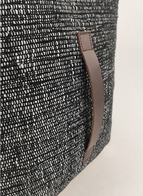 This pouf provides a stylish and comfortable seating solution. It is crafted from black cotton material and features a luxe leather handle for easy portability. Perfect for any room decor and house decor. this pouf is both fashionable and functional.