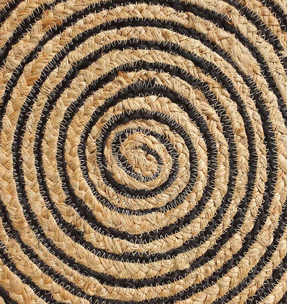 Striking spiral lines give this round rug a bold and modern look. Crafted from pure jute, it features a natural beige base with continuous black braided stripes that form a clean circular pattern. The tight weave highlights the center swirl and adds depth without heavy detailing. Its firm texture ensures durability for daily use while keeping an organic feel underfoot. The strong contrast makes it easy to pair with minimal or contemporary interiors. This round spiral jute rug creates a dynamic focal point in any space. Designed for everyday living, it also works beautifully as a stylish black striped rug and a dependable braided jute rug for natural homes.