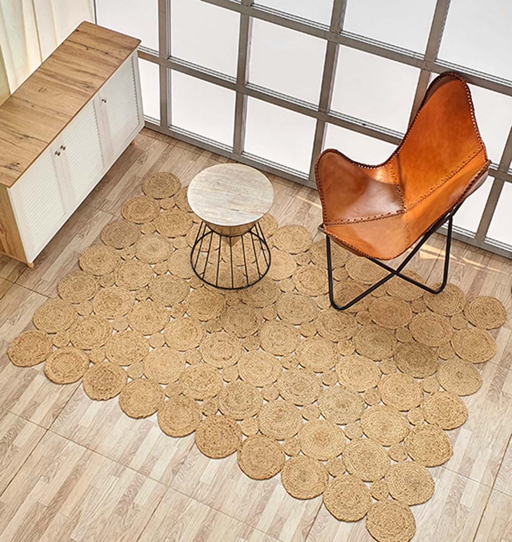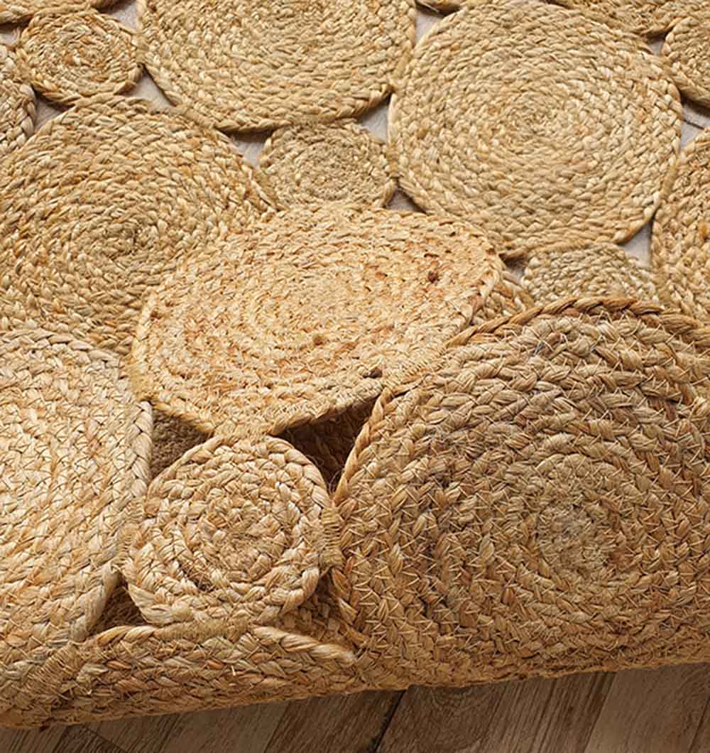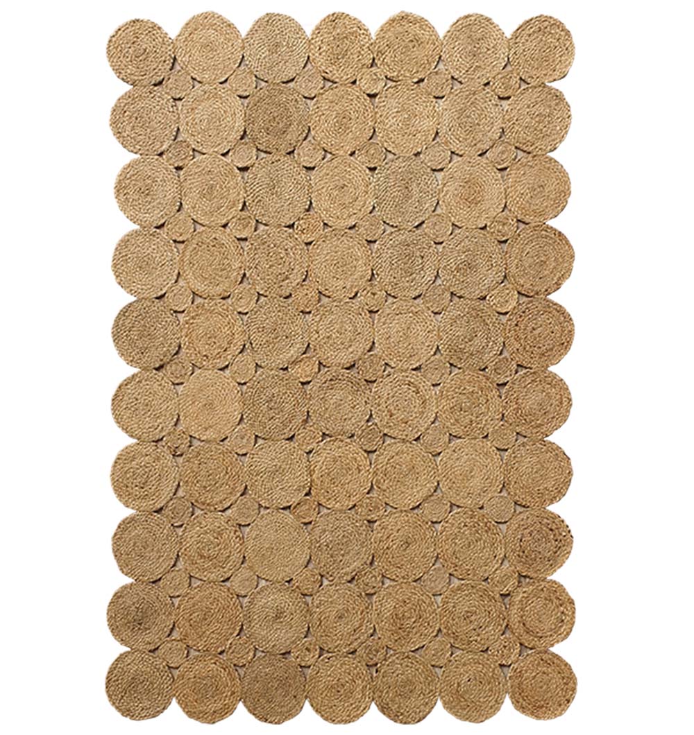 Distinct and textured, this rectangle rug is crafted from multiple braided jute circles arranged in a neat grid. The warm, natural beige tone highlights the organic beauty of pure jute while the raised circular pattern adds depth and visual interest. Each braided disc creates a layered look that feels handcrafted and unique. The sturdy construction ensures durability for everyday use, while the detailed surface brings character without bold colors. This round pattern jute rug stands out with its sculpted texture and natural appeal. Designed for homes that value detail, it works beautifully as a statement braided jute rug and a versatile natural fiber area rug for grounded, earthy interiors.