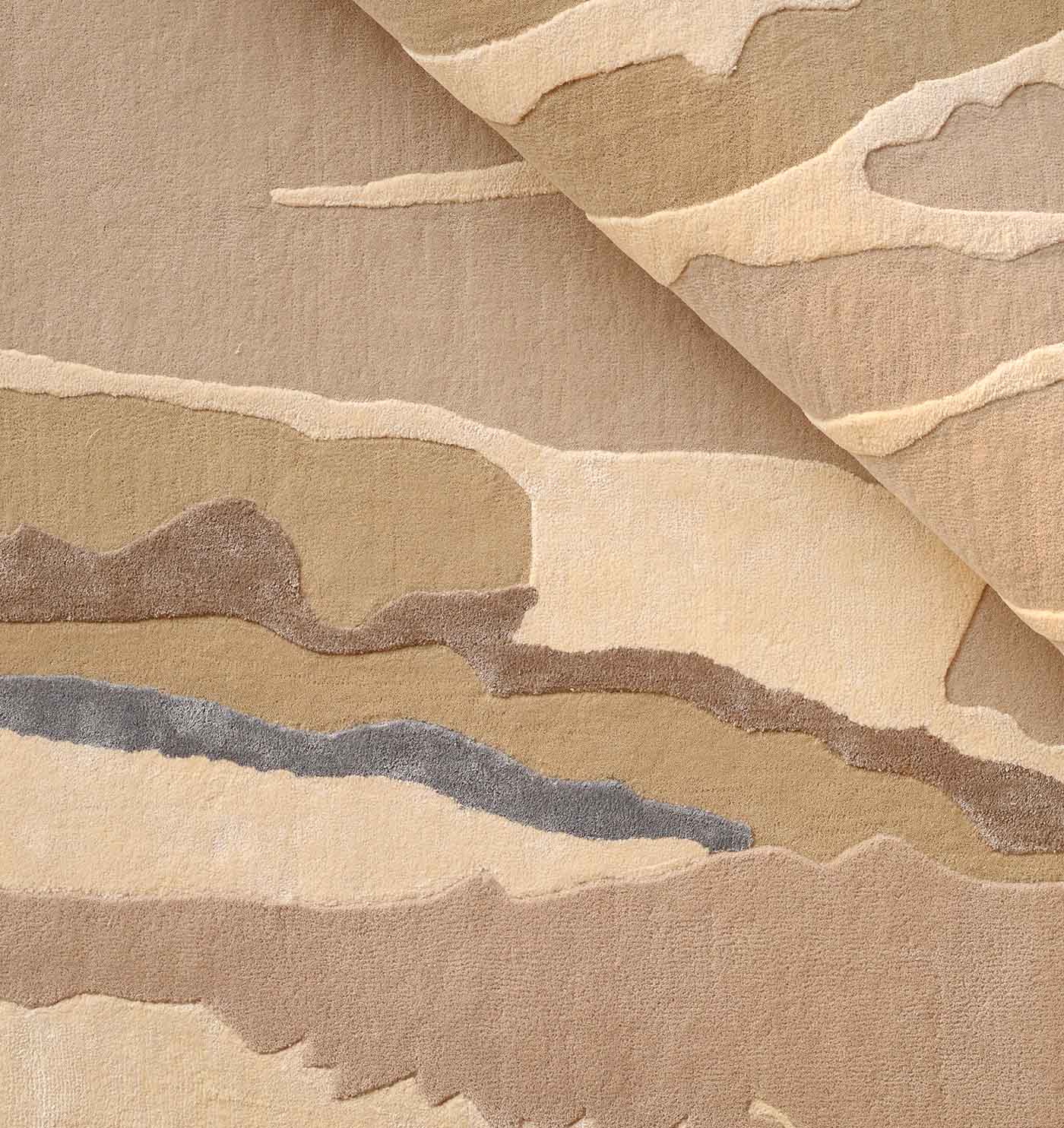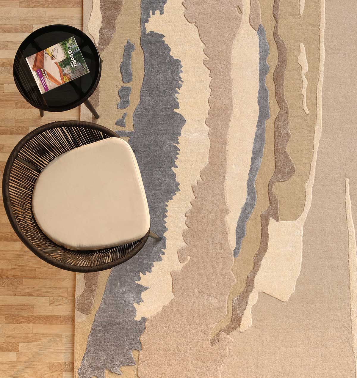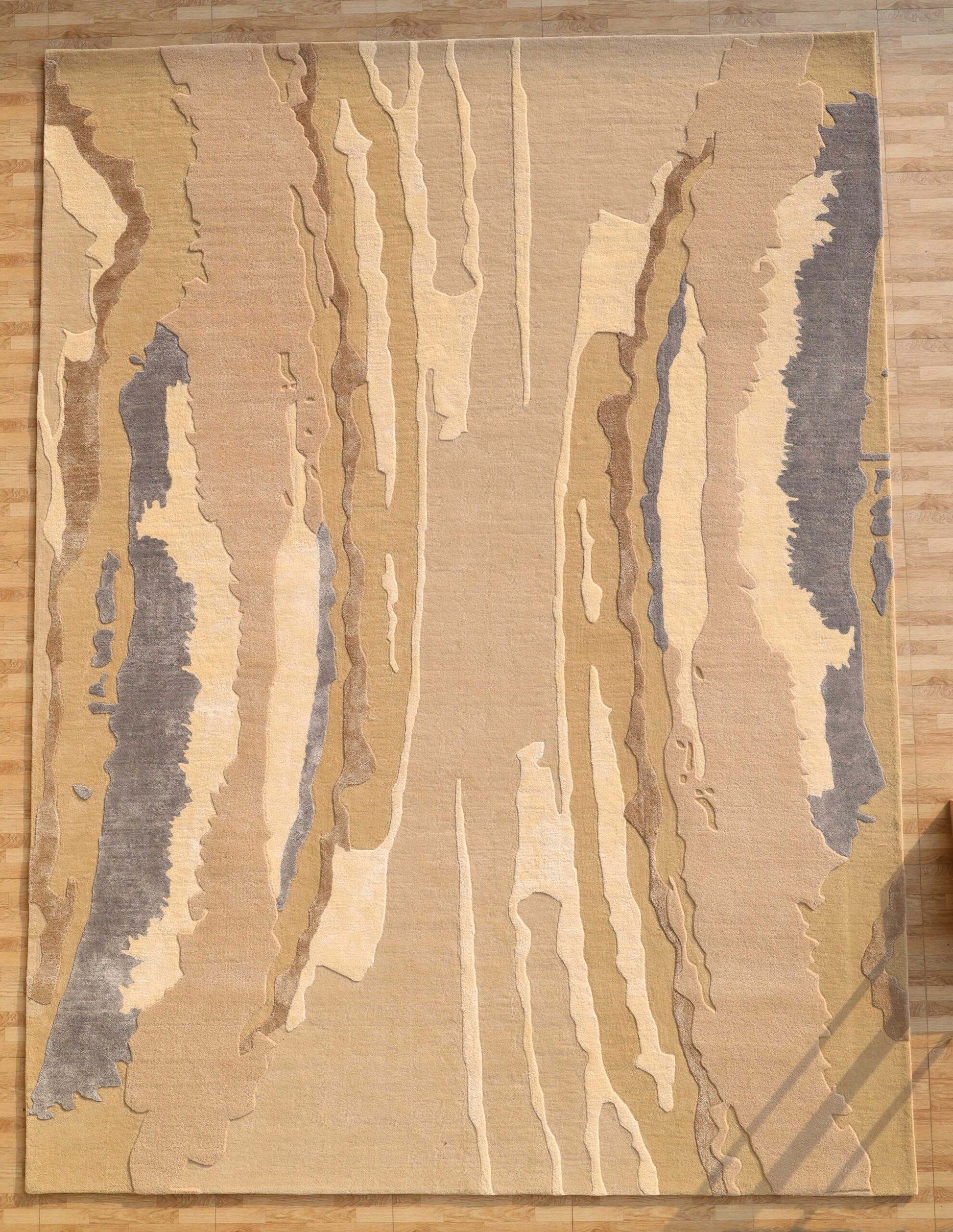 With its layered, streaked pattern, this rectangular rug adds movement while staying easy on the eyes. Warm beige and sand tones run through the center, framed by touches of taupe, cream, and soft grey for balance. The handtufted surface feels smooth and slightly plush, and the viscose, wool, and cotton blend gives subtle shine in the lighter areas. Use it as a beige area rug to warm up wood floors, or place it under a sofa as a hand tufted viscose rug when you want a refined look without loud color. The pattern reads like a neutral abstract rug, making it simple to match with modern or classic furniture.