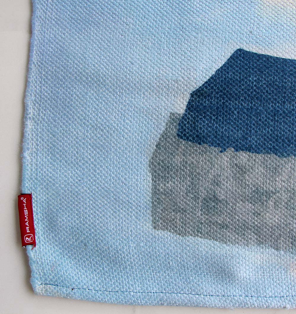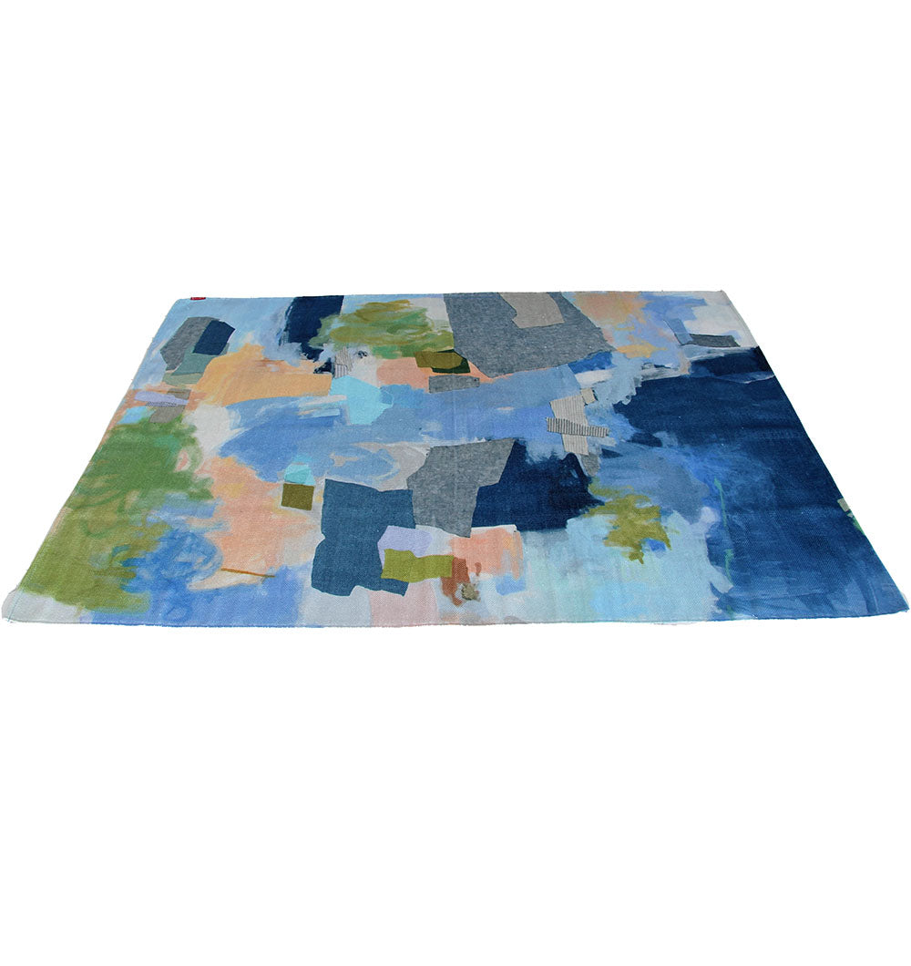 Bring an art-studio feel home with this abstract blue rug, mixing navy, sky blue, grey, soft beige, peach, and touches of olive green. The layered blocks and brushed textures add depth without looking busy, making it easy to style with light woods, linen sofas, and neutral walls. This digital printed dhurry has a clean, flat look that works well in high-use spaces and under furniture. Use it as a modern area rug to brighten a calm corner or give a contemporary room a fresh pop of color.