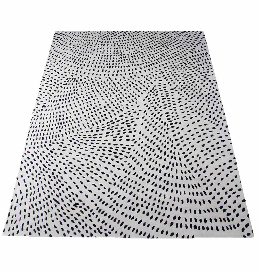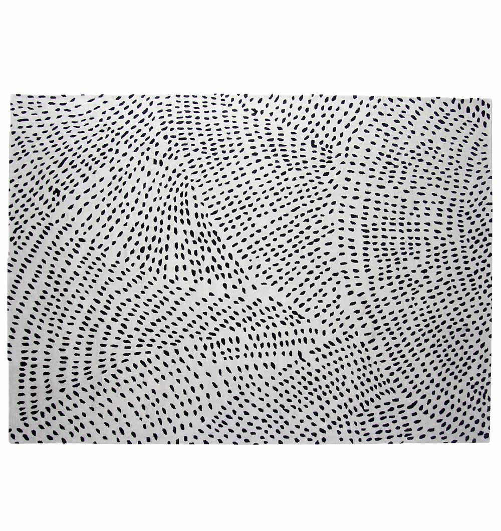 Bright ivory with scattered black dash marks, this rug has a playful, hand-drawn look that adds pattern without heavy color. Wool gives it warmth and a soft feel, tencel adds a smoother touch with a slight sheen, and cotton supports everyday comfort. The all-over design helps hide small marks and works well with both modern and casual rooms. As a hand tufted rug, it feels plush underfoot and the dotted texture stays clear across the surface. Style it with light woods, black accents, or simple solid fabrics. A clean black and white rug that also works as a calm tencel wool rug for easy styling.