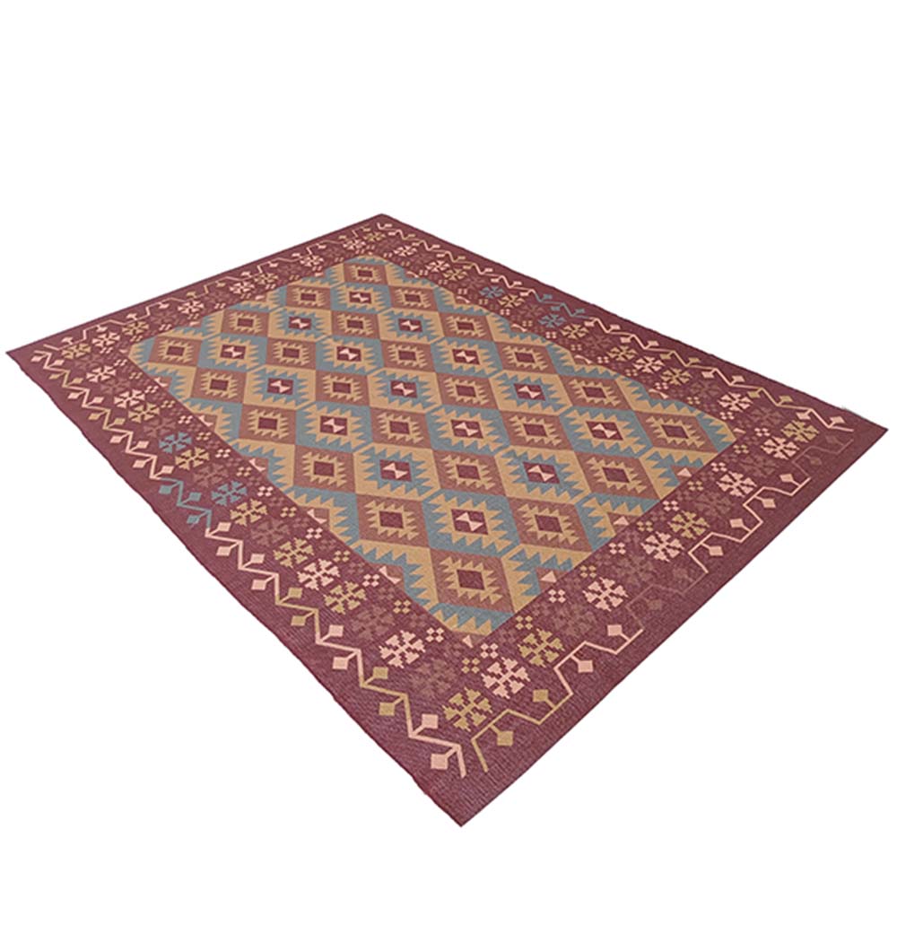 Bring warm desert tones to your space with this purple geometric rug featuring a bold diamond layout and tribal-inspired border. The mix of plum, teal, mustard, and beige create a rich look that works with both modern and classic decor. This diamond pattern rug adds structure without feeling heavy, making it easy to style under a coffee table or beside the bed. The tribal dhurry rug design gives a flat, clean finish that’s simple to live with and easy to match with neutral furniture and natural wood accents.