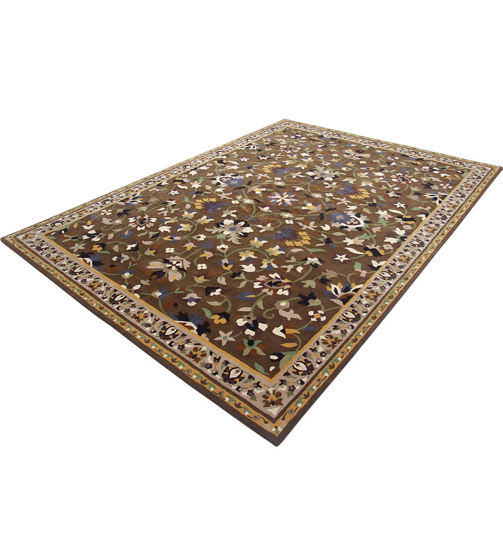 Warm chocolate brown creates a rich backdrop for detailed florals in cream, sage, muted blue, and touches of mustard, all framed by an ornate ivory border. The look is classic and welcoming, and the darker field helps the pattern feel grounded and practical in everyday spaces. Wool adds a cozy feel underfoot, while cotton supports comfortable daily use. As a hand tufted rug, it offers a plush surface and crisp detailing that suits both traditional and transitional rooms. Pair it with wood furniture and neutral seating to let the design stand out as a timeless traditional floral rug and a practical brown wool rug.