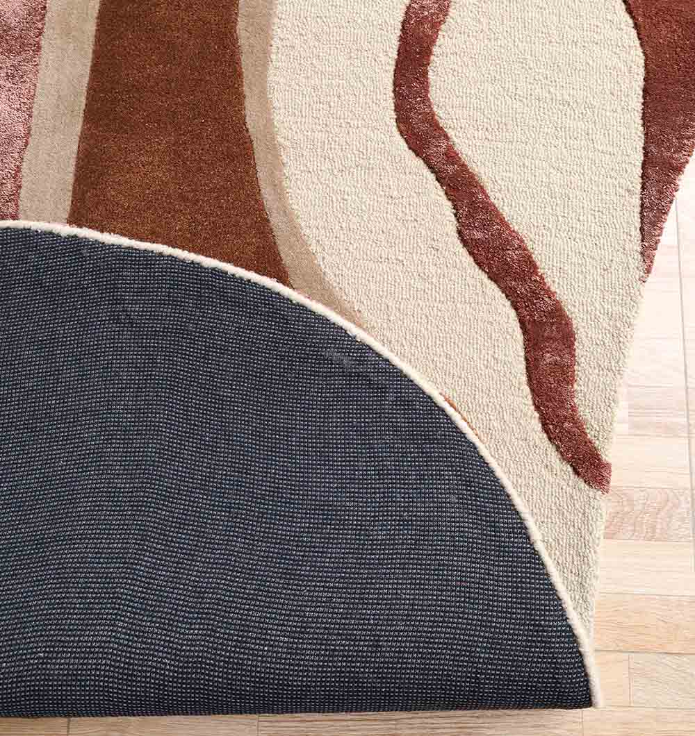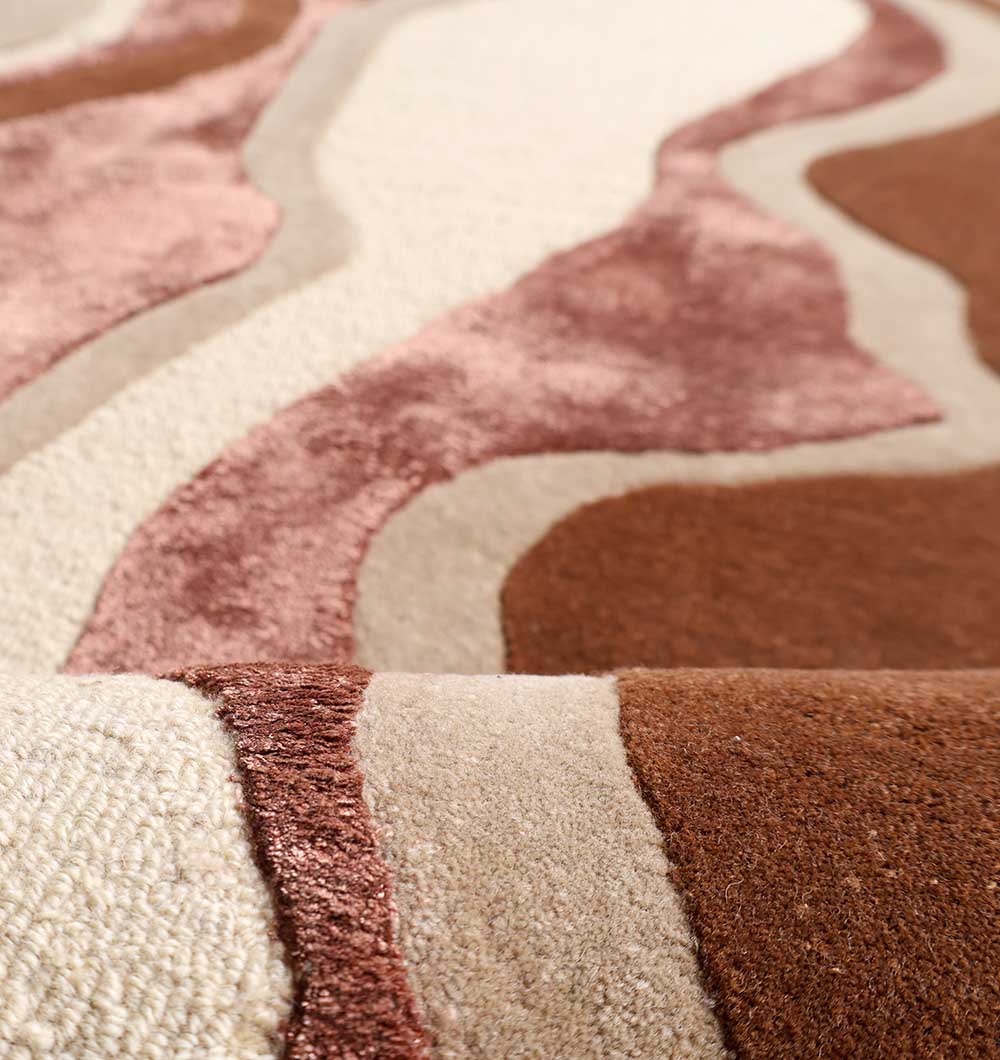 Cream, taupe, cocoa brown, and dusty rose flow in soft, wavy bands for a warm, modern look. This abstract irregular rug adds movement without feeling loud, and the carved lines give gentle texture underfoot. Style it with wood tones, black accents, or light fabrics for an easy update. Use it as a modern neutral rug that still brings color and enjoy the smooth sheen from its viscose blend. Finished as a hand tufted wool rug, it feels cozy while keeping a clean, contemporary vibe.