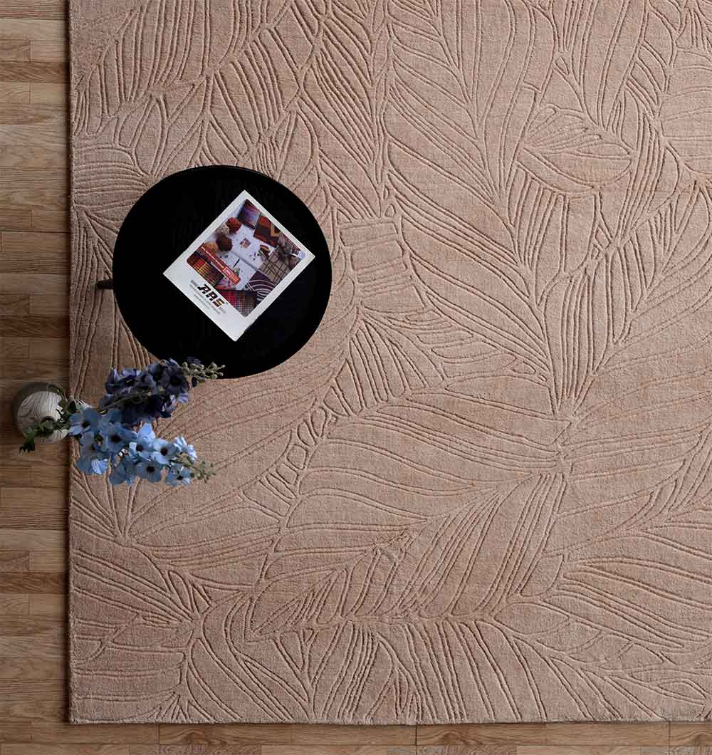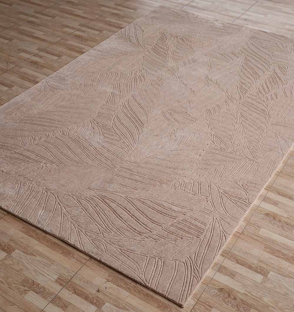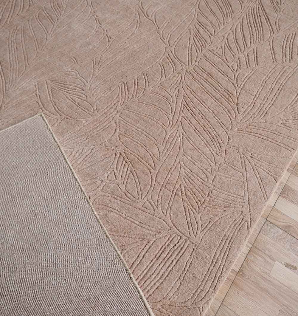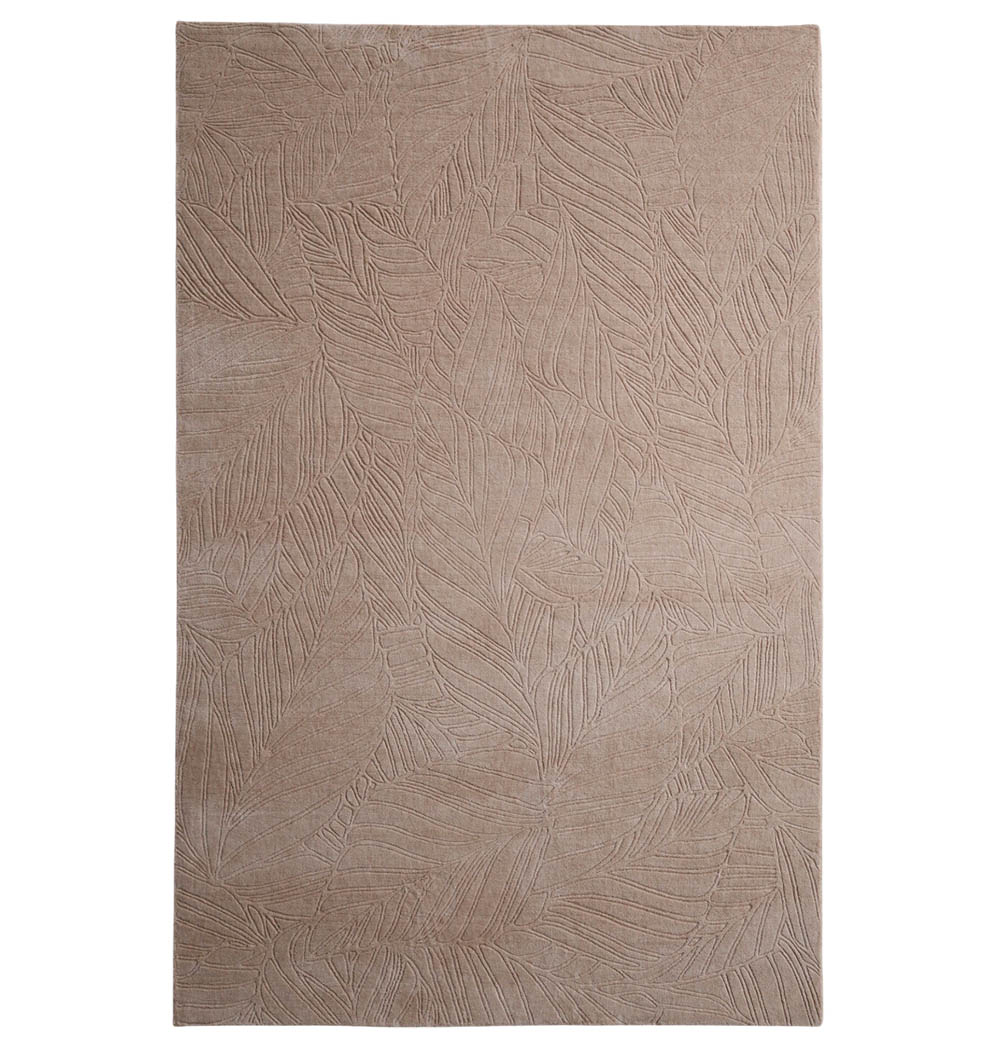 Subtle leaf outlines are carved across this rectangular rug, adding a soft pattern that stays easy on the eyes. The color is warm taupe-beige with gentle shadowing in the etched lines, so it blends smoothly with wood tones and neutral furniture. Loom knotted for a neat, even finish, the polyester and cotton mix feels smooth underfoot and suits everyday use. Use it as a leaf pattern rug to bring a natural touch to a modern space, or keep things calm with a taupe area rug that layers well with creams and browns. The quiet texture also makes it a versatile neutral textured rug for simple, clean interiors.