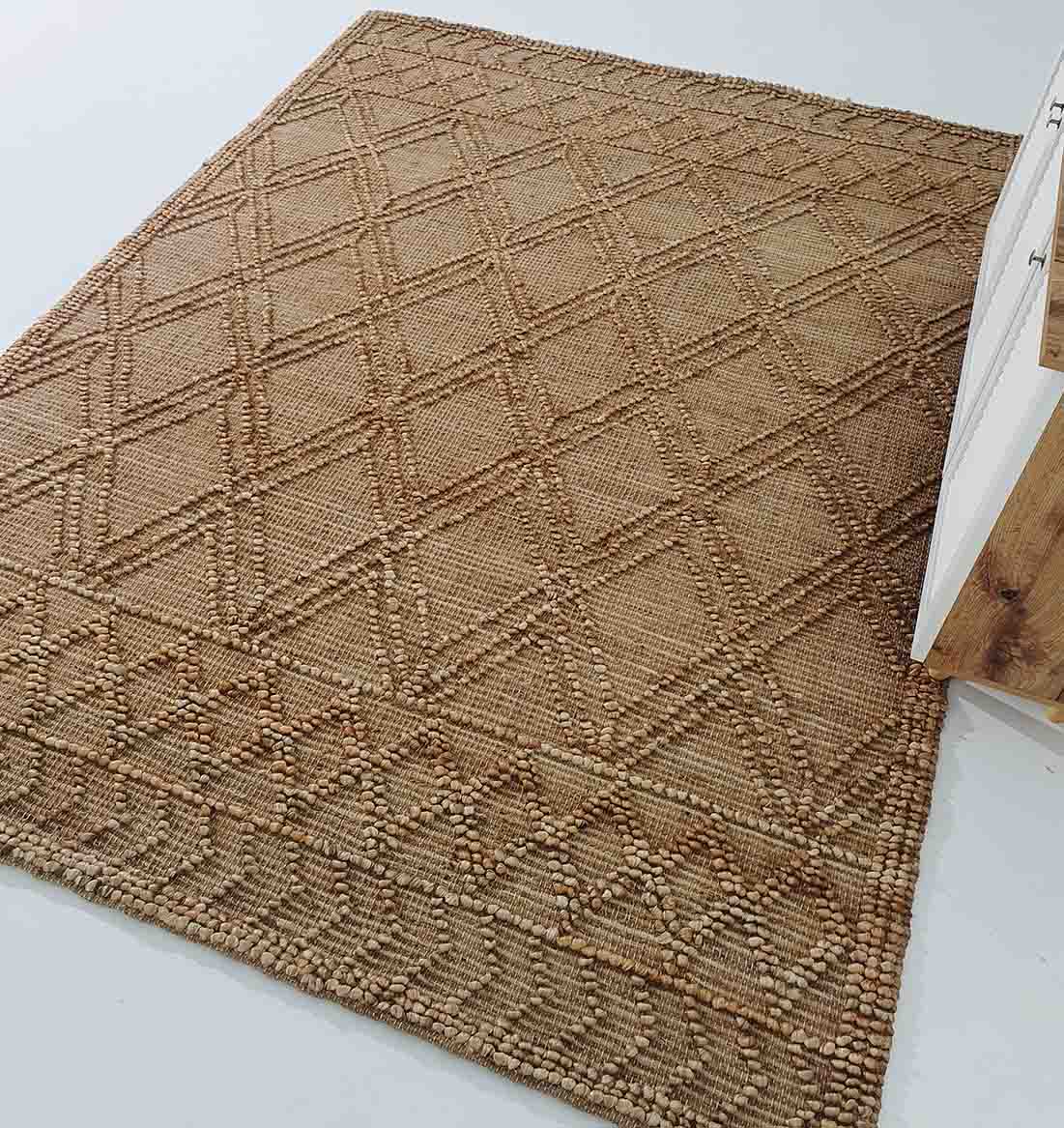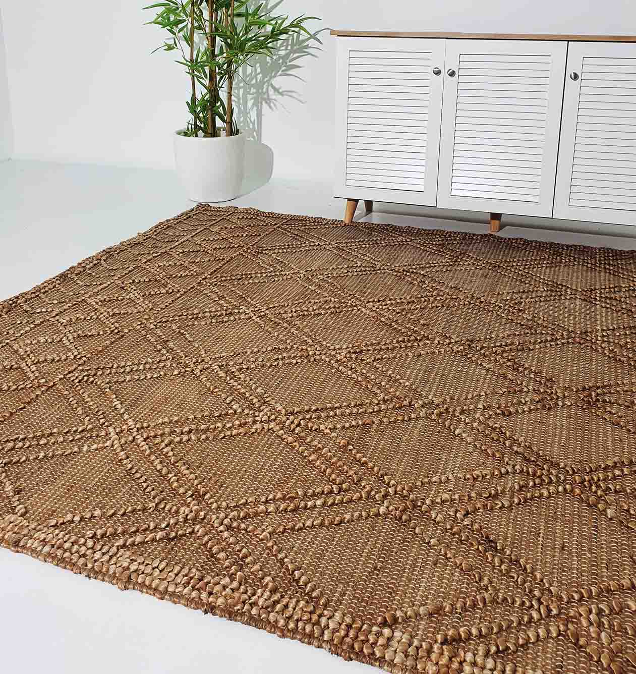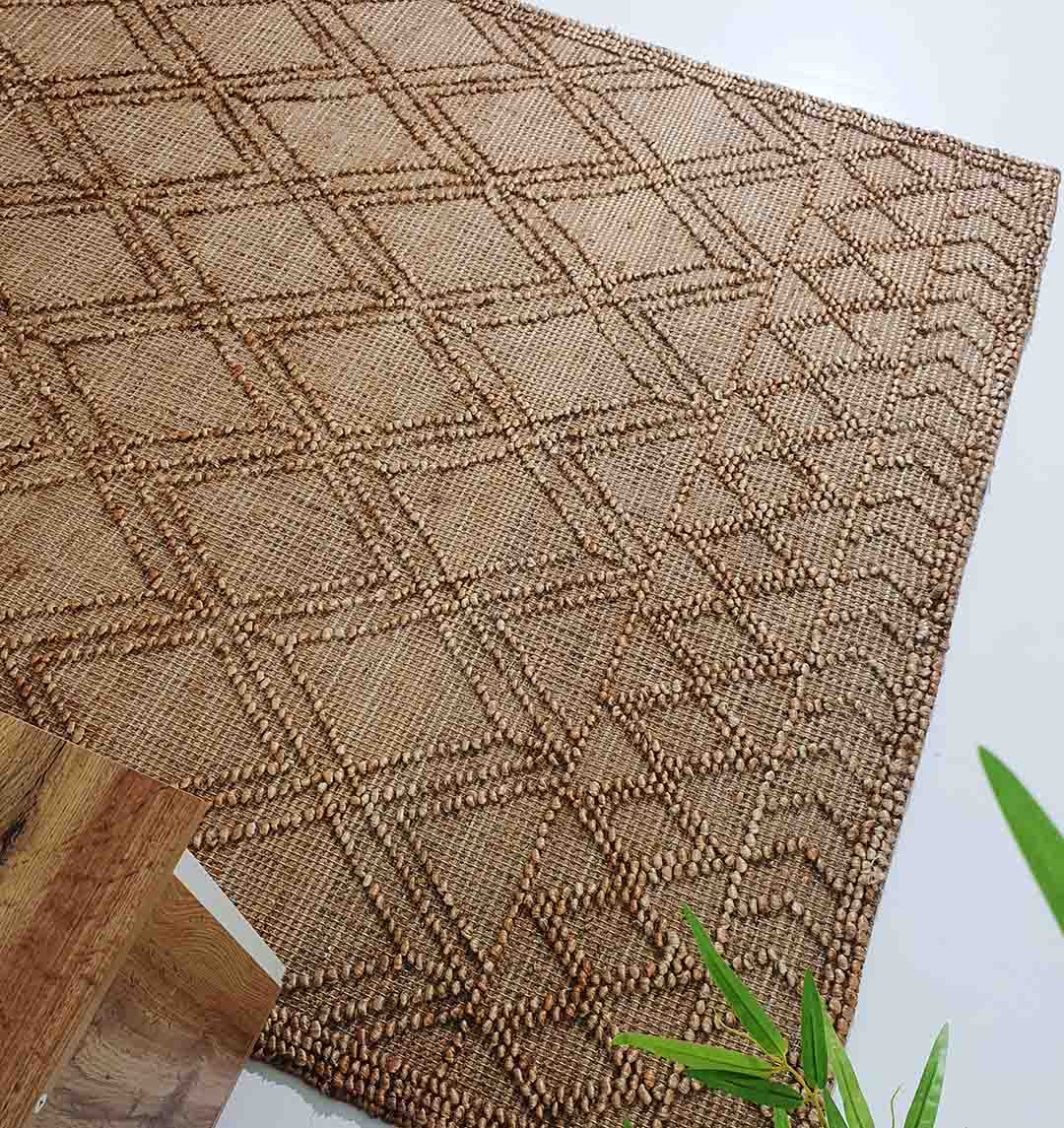 Add warm, natural texture with this tan and brown rug, woven in a clean diamond pattern with a framed border. The flat weave keeps it easy to place under furniture, while the raised details bring a soft, earthy look. This jute cotton rug is a great pick for everyday styling, giving your space a calm, grounded feel without heavy color. Use it as a natural jute rug to brighten neutral rooms, or as a geometric jute rug to add pattern in a simple way.