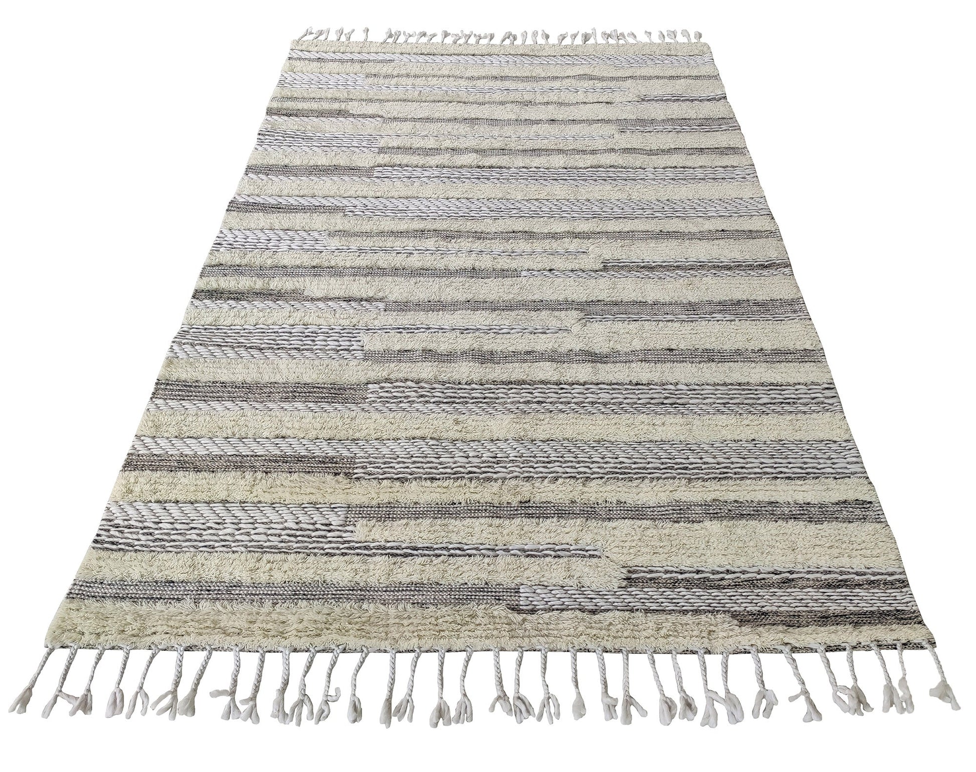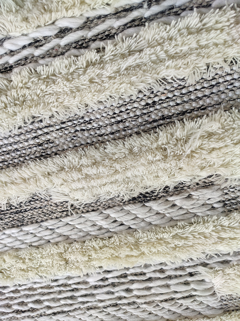 Bring a calm, layered look to your space with this rectangle rug in soft grey and ivory. The mix of smooth woven bands and plush textured rows adds depth without feeling busy, and the fringe ends give it a relaxed finish. Made with a polyester, wool, and cotton blend, it feels cozy underfoot while staying easy to style with wood tones, light sofas, or modern accents. This striped woven rug works beautifully in open seating areas, adds warmth near the bed, and keeps a tidy look in a work corner. If you want texture with clean lines, this grey and ivory rug is an easy upgrade, and the textured wool blend rug pattern keeps the room looking fresh and balanced.