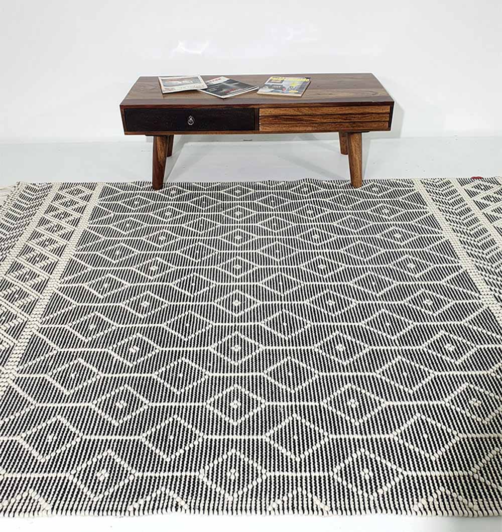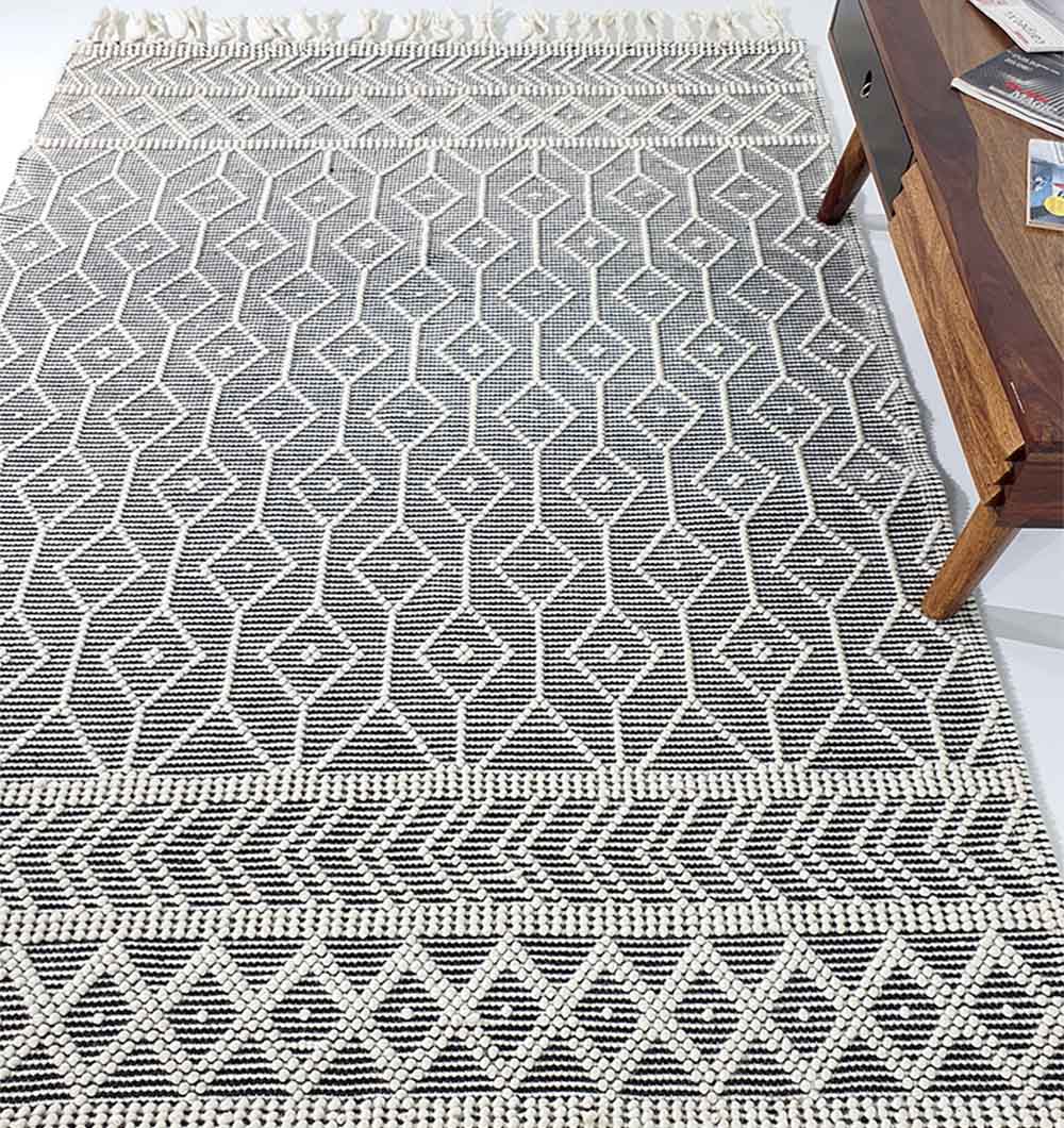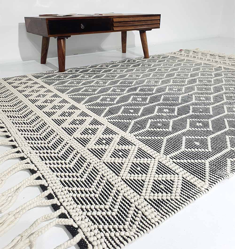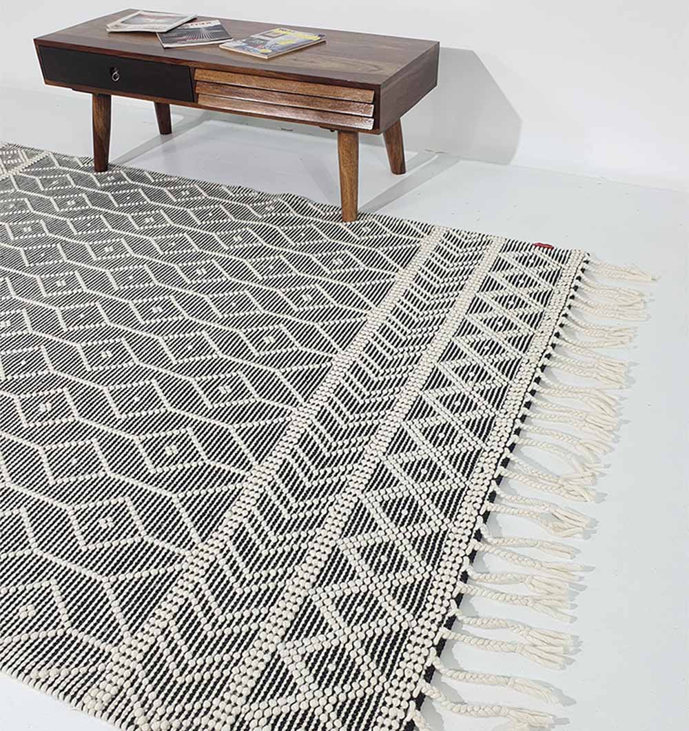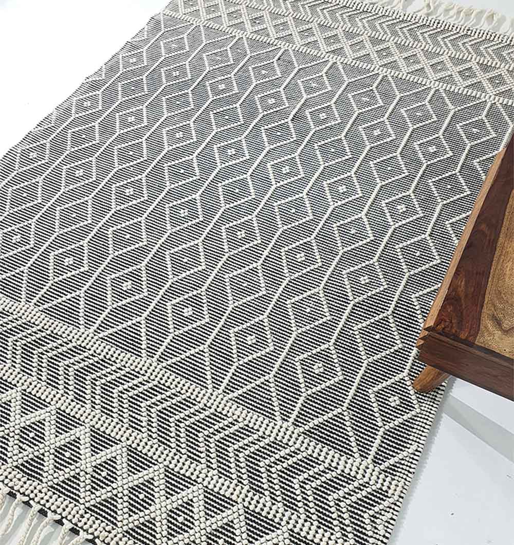 Bring bold contrast to your space with this black and ivory rug, finished with a crisp diamond pattern and textured borders. The flat woven surface feels neat and structured, making it easy to layer with modern, boho, or minimal decor. Made as a wool cotton rug, it adds cozy warmth while staying breathable and comfortable underfoot. Use it to anchor seating, define a reading corner, or add clean pattern to an open layout. This geometric woven rug is a simple way to refresh the room without heavy color.