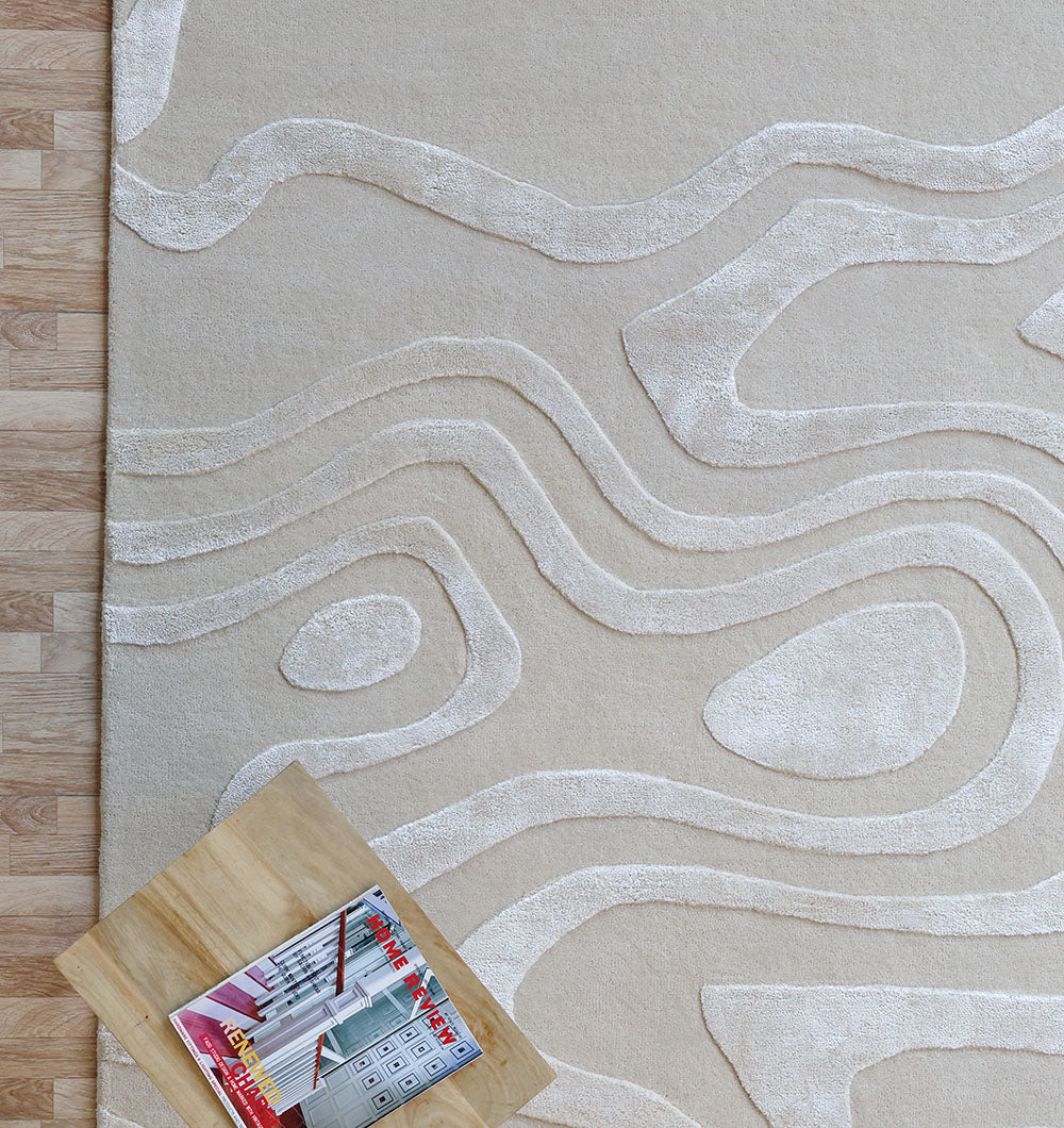 Bring calm movement to your space with this neutral area rug in warm beige and ivory. Raised, carved lines create a flowing map-like pattern that adds depth while keeping the look clean and modern. The soft mix of wool, viscose, and cotton feels cozy underfoot, and the handtufted finish gives the surface a gentle sheen. Style it with light wood, cream seating, and minimal decor for an easy, layered look. This topographic rug also works as a subtle statement modern abstract rug without overwhelming the room.