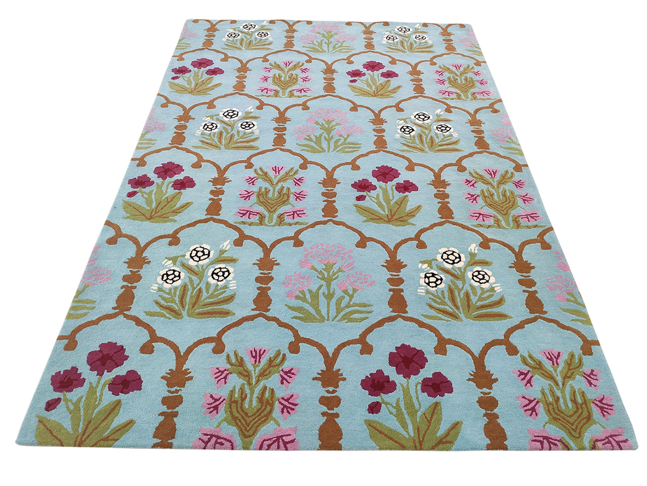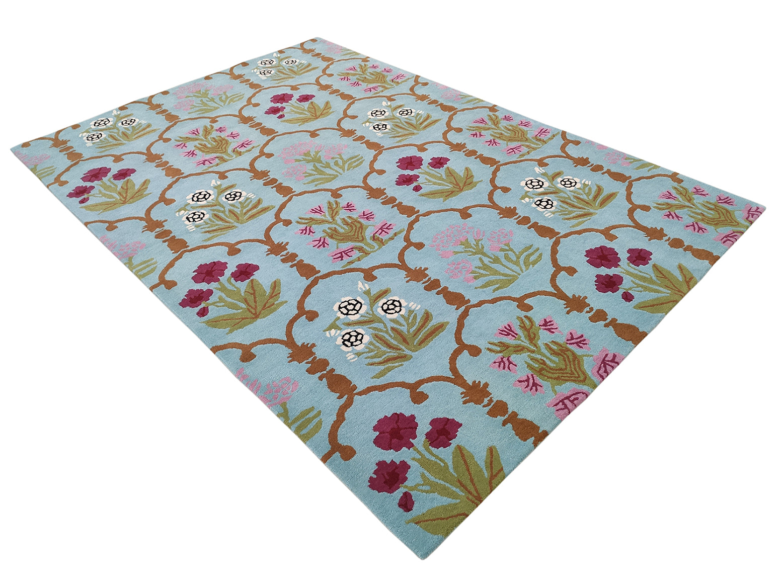 Soft sky-blue sets a calm base, while a repeated floral bouquet in pink, plum, olive, and white. This hand tufted wool rug is crafted from natural New Zealand wool for a cushioned feel and a tidy surface that suits daily use. The all-over pattern makes it an easy floral area rug for layering with plain furniture, and it reads well as a blue wool rug to brighten smaller spaces without feeling loud.
