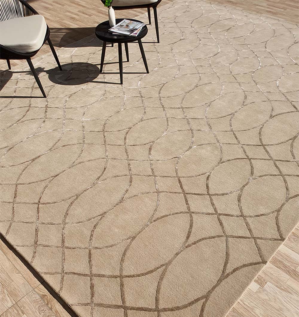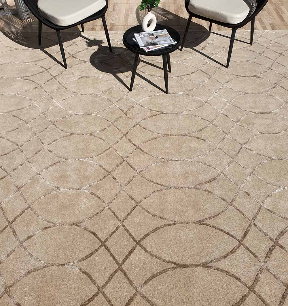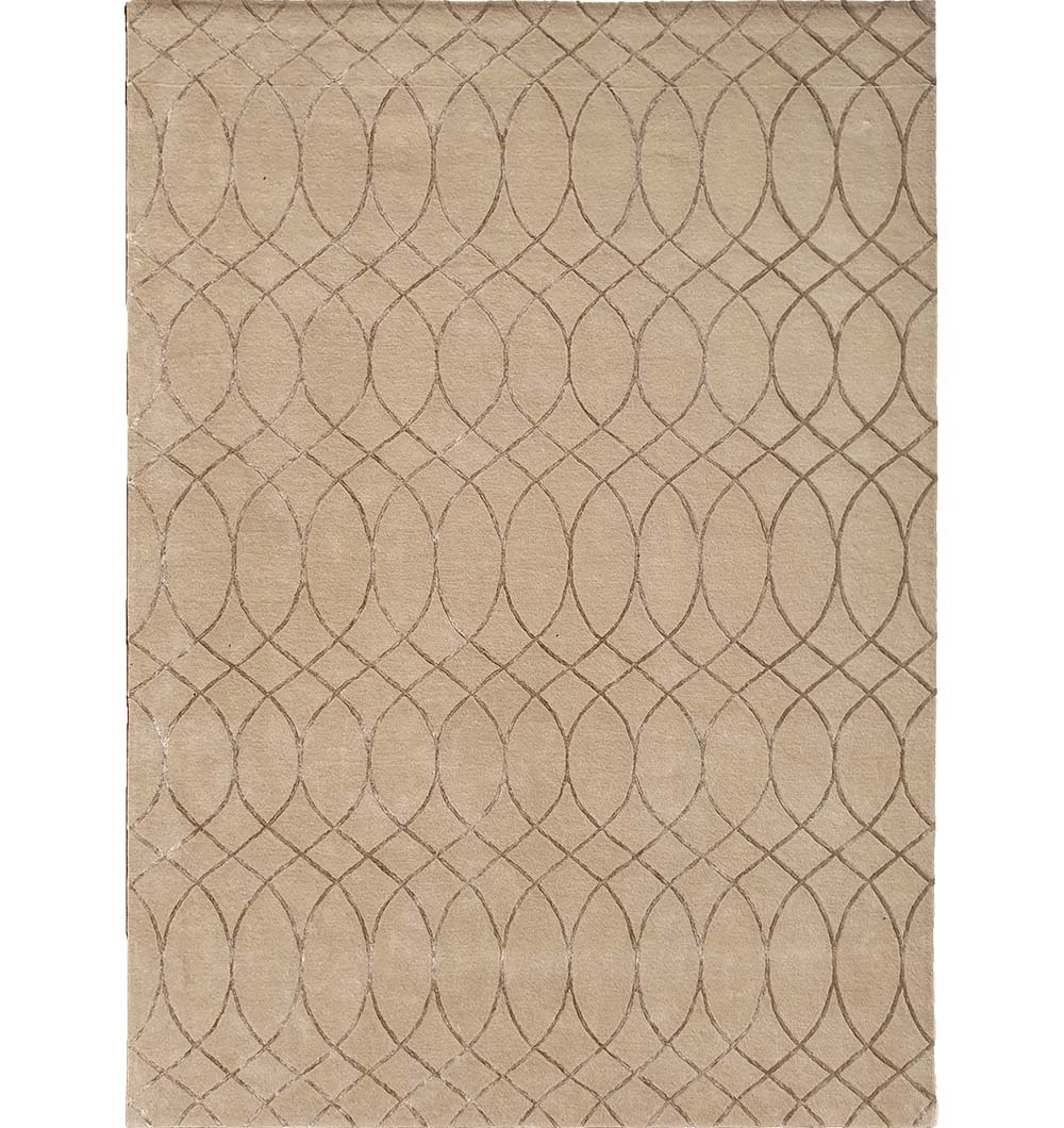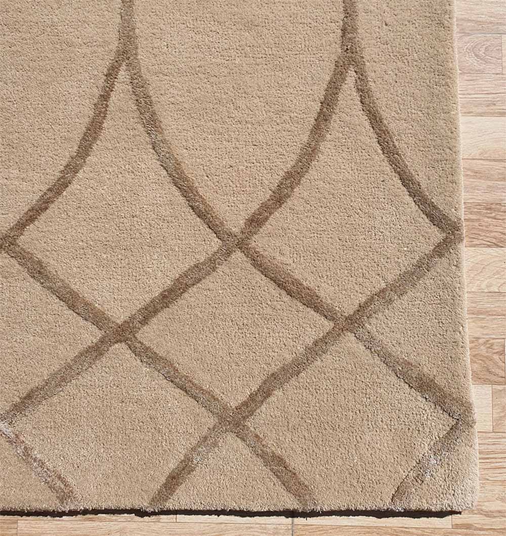 This sophisticated tan hand tufted wool rug features an elegant trellis of interlocking ogee curves that creates a sense of continuous, rhythmic movement across your floor. Expertly crafted from a premium blend of 60% wool, 20% Tencel, and 20% cotton, it offers a luxurious, multi-textured surface where the Tencel fibers provide a delicate, silky luster against the matte wool base. The hand tufted construction creates a dense, plush pile that delivers exceptional comfort while maintaining the durability needed for high-traffic living areas. With its soft, monochromatic palette and refined geometric linework, this contemporary rectangle rug serves as a timeless foundation that seamlessly complements both modern and traditional interiors. This hand tufted floor covering is an artisanal masterpiece designed to add a layer of understated elegance and tactile warmth to your home.