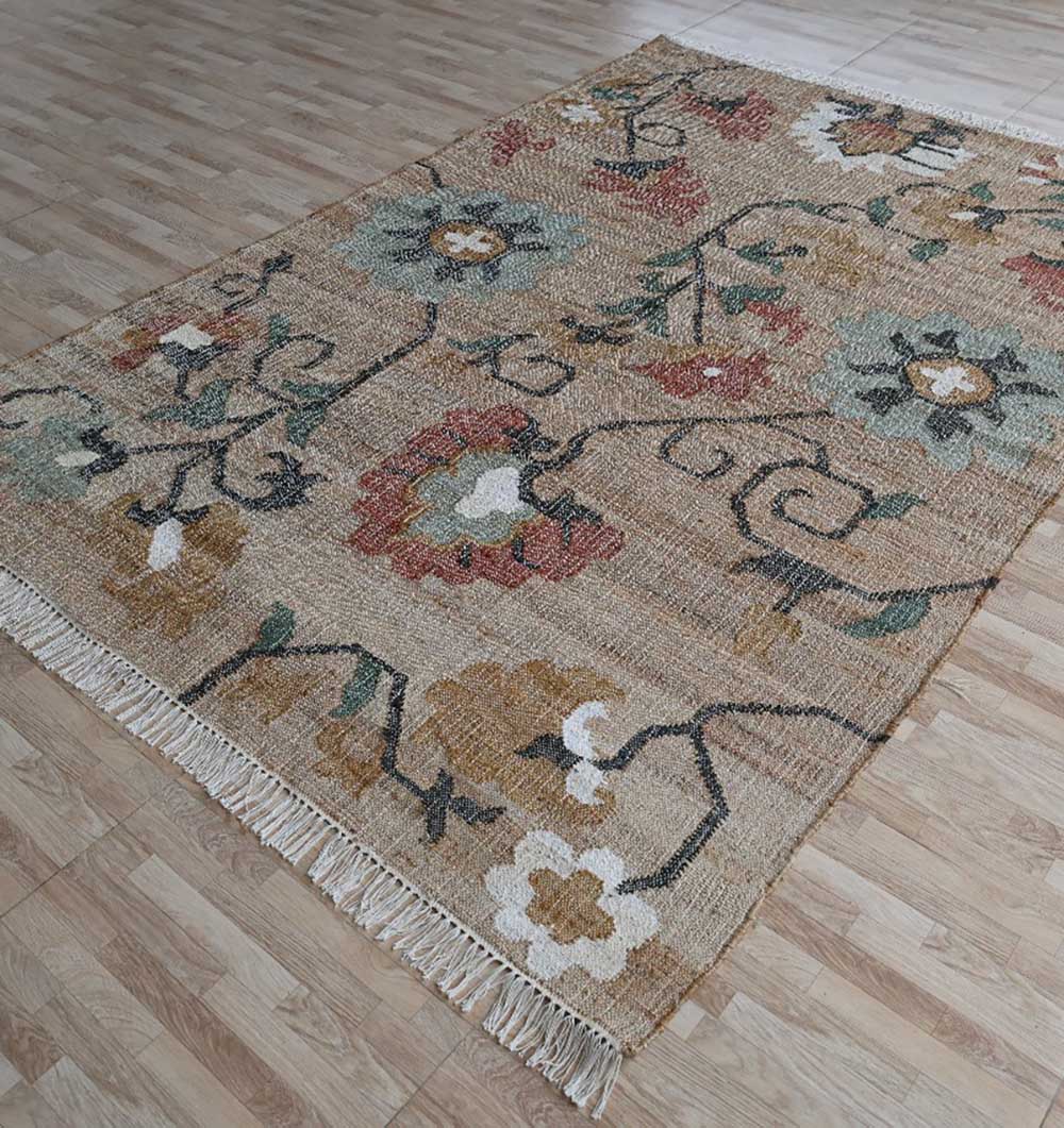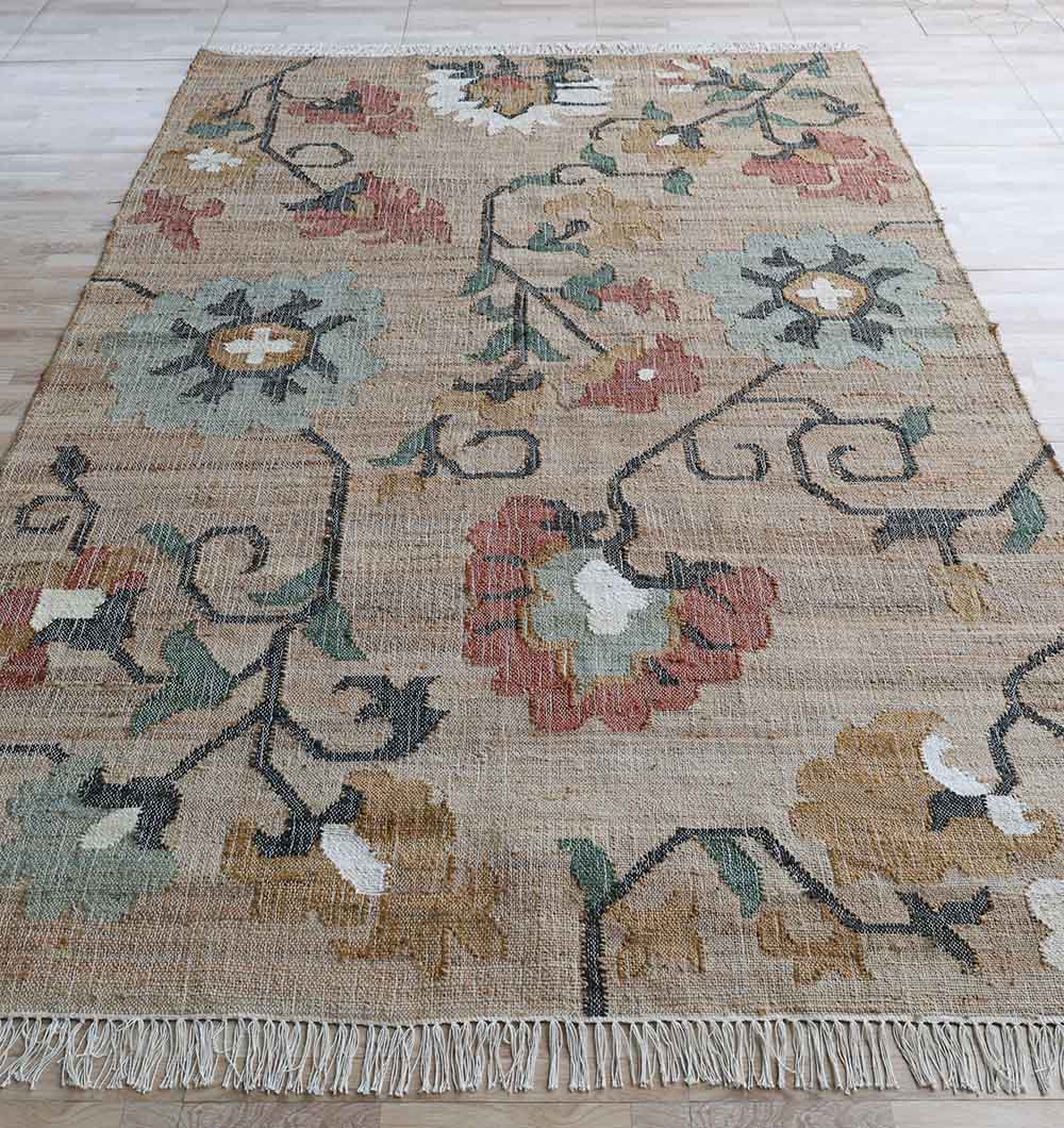 Earthy beige forms the base of this rectangular design, decorated with soft floral motifs in dusty red, sage green, ivory, and muted gold. Flowing vine details connect the blossoms, creating a relaxed pattern with subtle movement across the surface. Woven as a kilim rug, it offers a flat, low profile that fits neatly under furniture and works well in layered settings. Made from jute and cotton, this jute kilim rug adds natural texture with a breathable, lightweight feel suited for everyday use. Fringe edges complete the casual finish. Choose this boho floral rug to bring warmth and gentle color into a calm, neutral interior.