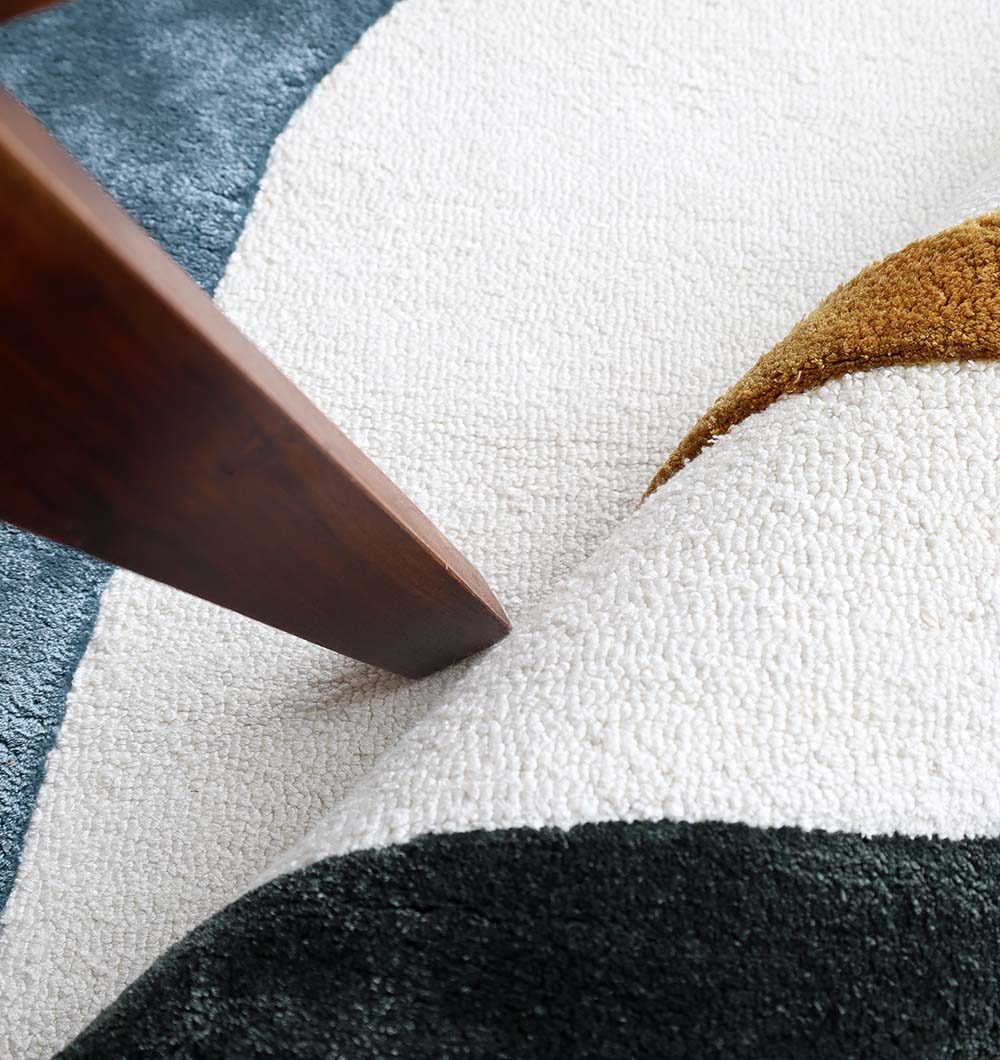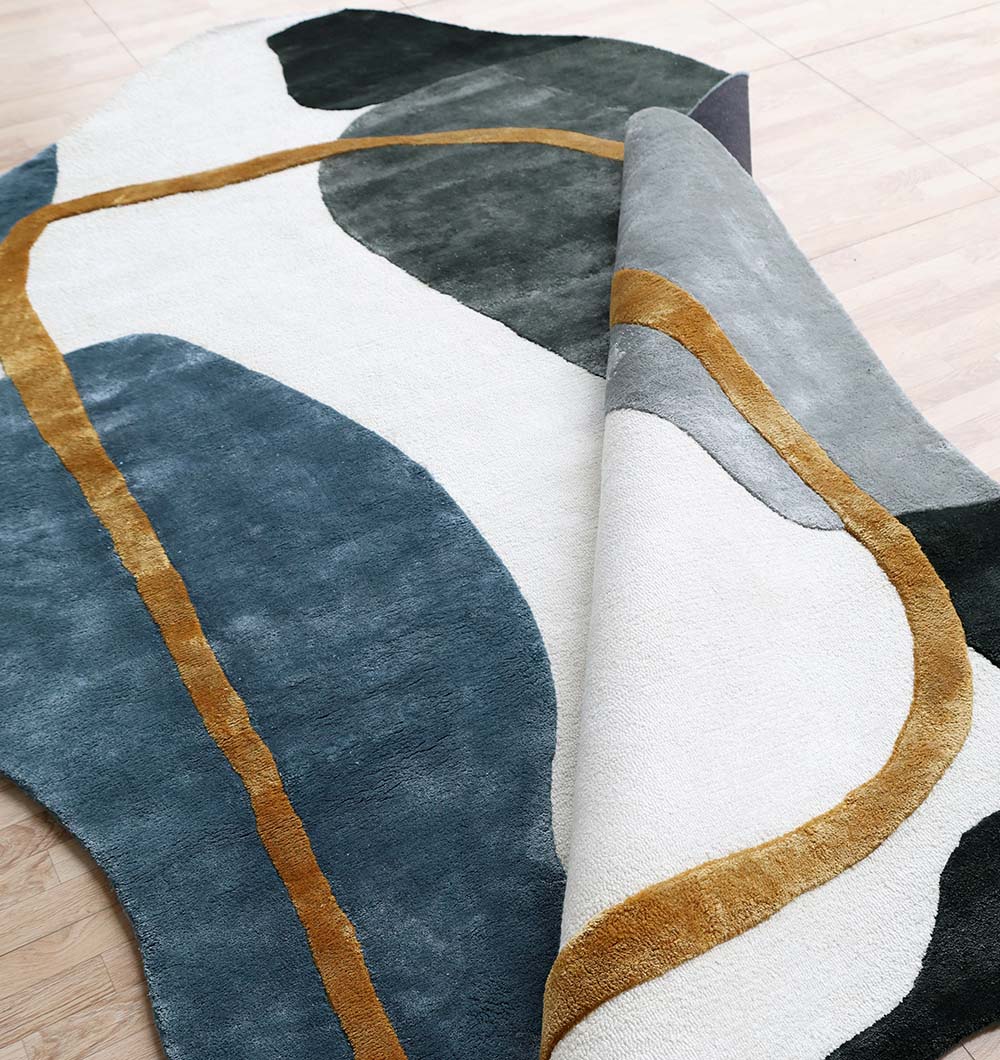 Soft cream meets moody charcoal, slate blue, and misty gray in bold, rounded blocks, finished with a warm mustard outline for a clean pop. This modern abstract rug brings gallery-style style to your floor while staying easy to match with neutral sofas and wood tones. The silky sheen and smooth feel come from the tencel blend, making it a great tencel rug for everyday lounging. Its freeform edges add a playful twist, so it stands out as an irregular area rug without taking over the room.