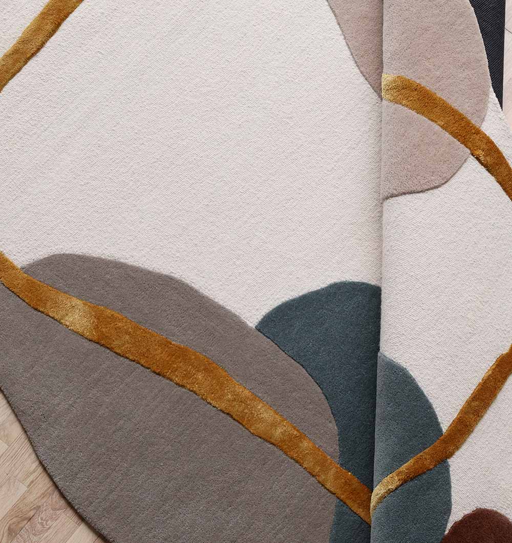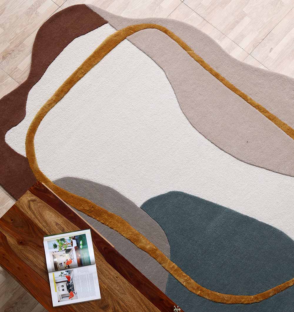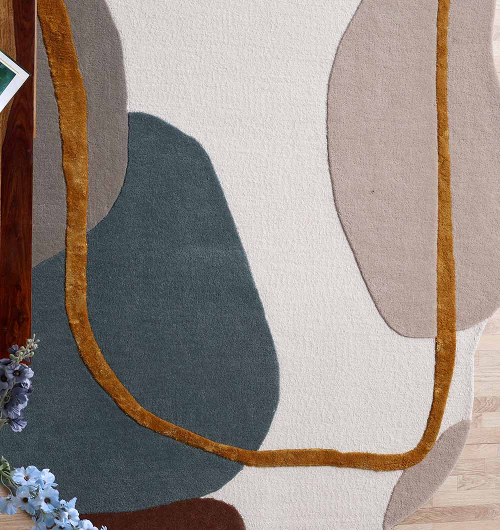 Soft ivory and taupe shapes flow across the surface, with deep teal accents and a warm mustard outline that adds a clean frame. This abstract irregular rug brings an artful look without feeling loud, and the smooth cut pile feels cozy underfoot. Style it with light woods, black details, or warm metals for an easy finish. A great modern neutral rug for calming busy rooms while still adding color and contrast. Use this hand tufted area rug to define a seating zone or add softness beside the bed.
