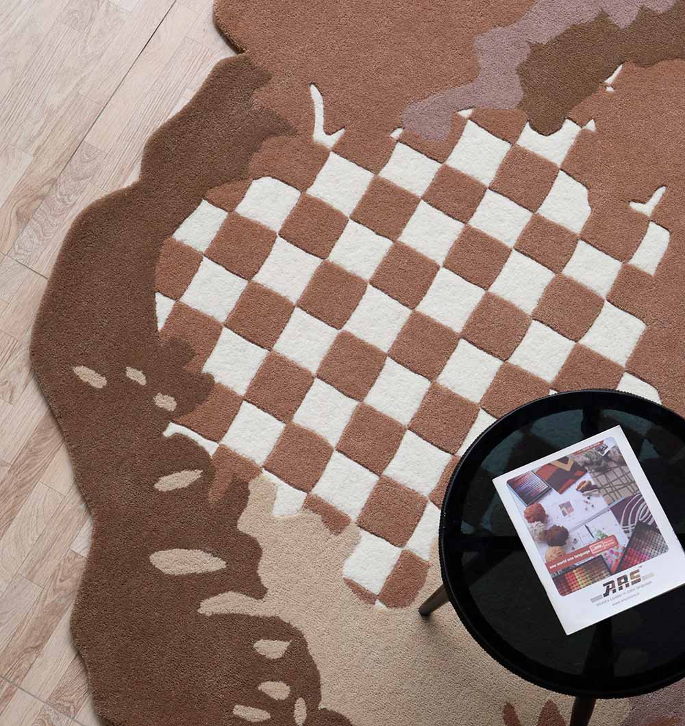 Bring artsy, warm style to your space with this brown area rug in cocoa, taupe, cream, and soft mauve. Abstract patches and paint-like edges create a laid-back look, while the bold checker squares add a modern twist. The irregular outline makes it feel custom and helps soften straight furniture lines. This checkered area rug works beautifully under a coffee table or as a statement piece in an open corner. Plush underfoot and easy to style with wood tones and neutral seating, this irregular shape rug is finished as a hand tufted rug for a cozy, textured feel.