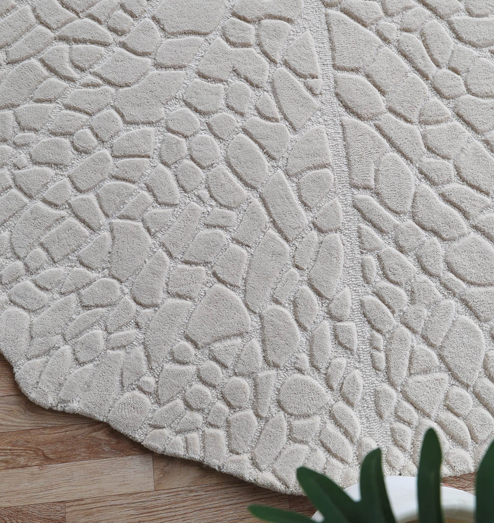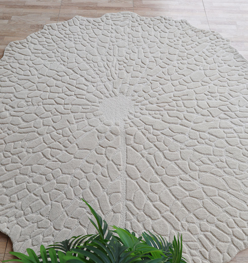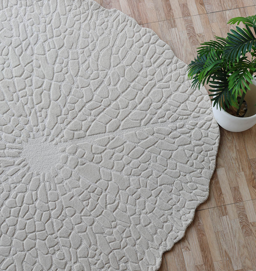 Soft and sculpted in light grey, this scalloped round area rug brings a calm, clean look to your space. The raised pebble pattern spreads from the center like a gentle sunburst, adding depth without loud color. Made as a hand tufted rug with wool and cotton, it feels cozy underfoot and helps reduce echo in open rooms. The tonal texture makes it easy to style with modern, minimal, or warm wood furniture. Use this textured wool rug to anchor a seating area or add a soft touch near the bed.
