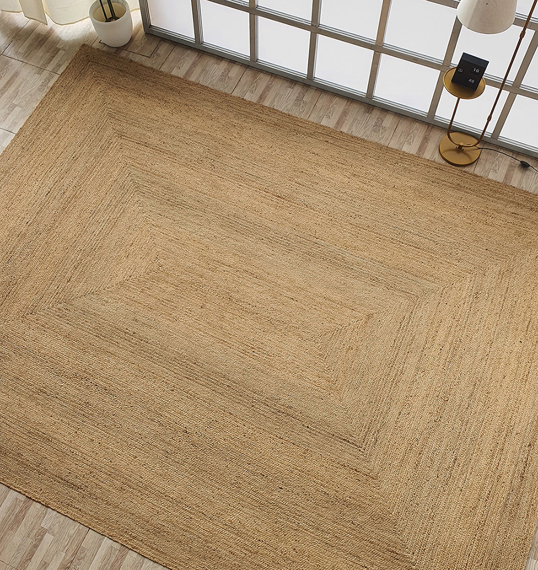 Natural texture meets subtle design in this rectangle rug crafted from pure jute. The warm beige tone is enhanced by a soft geometric pattern created through braided detailing, adding depth without bold contrast. Its sturdy braided construction ensures durability for everyday use while keeping an earthy and grounded feel. The gentle variation in weave gives the surface character and works well with wooden floors and neutral furniture. This geometric jute rug offers a clean yet distinctive look for modern interiors. Designed for practical living, it functions beautifully as a durable braided jute rug and a versatile natural jute area rug that blends comfort with simple style.