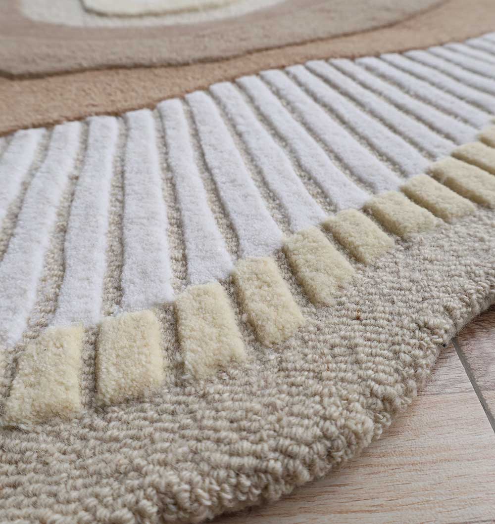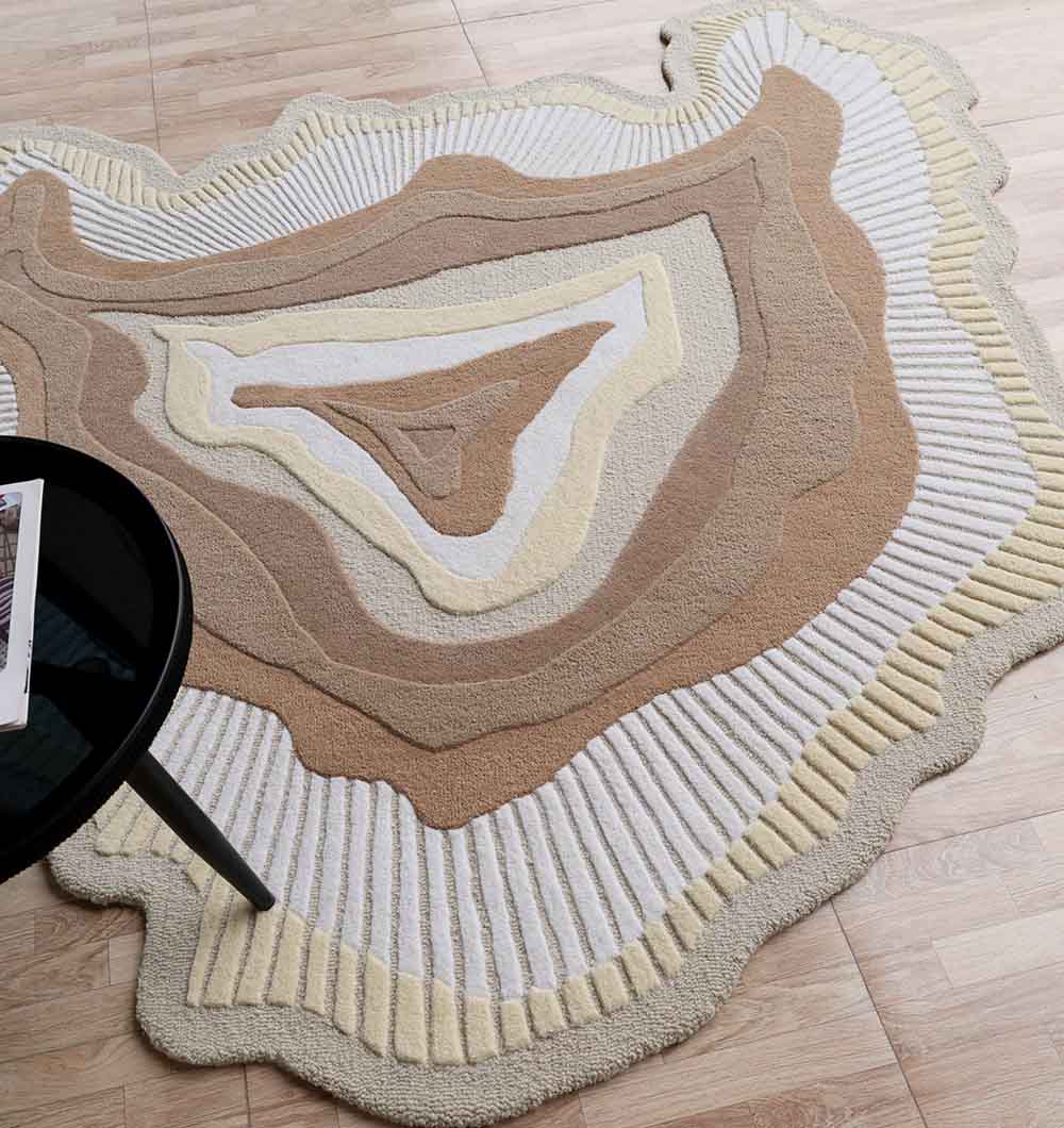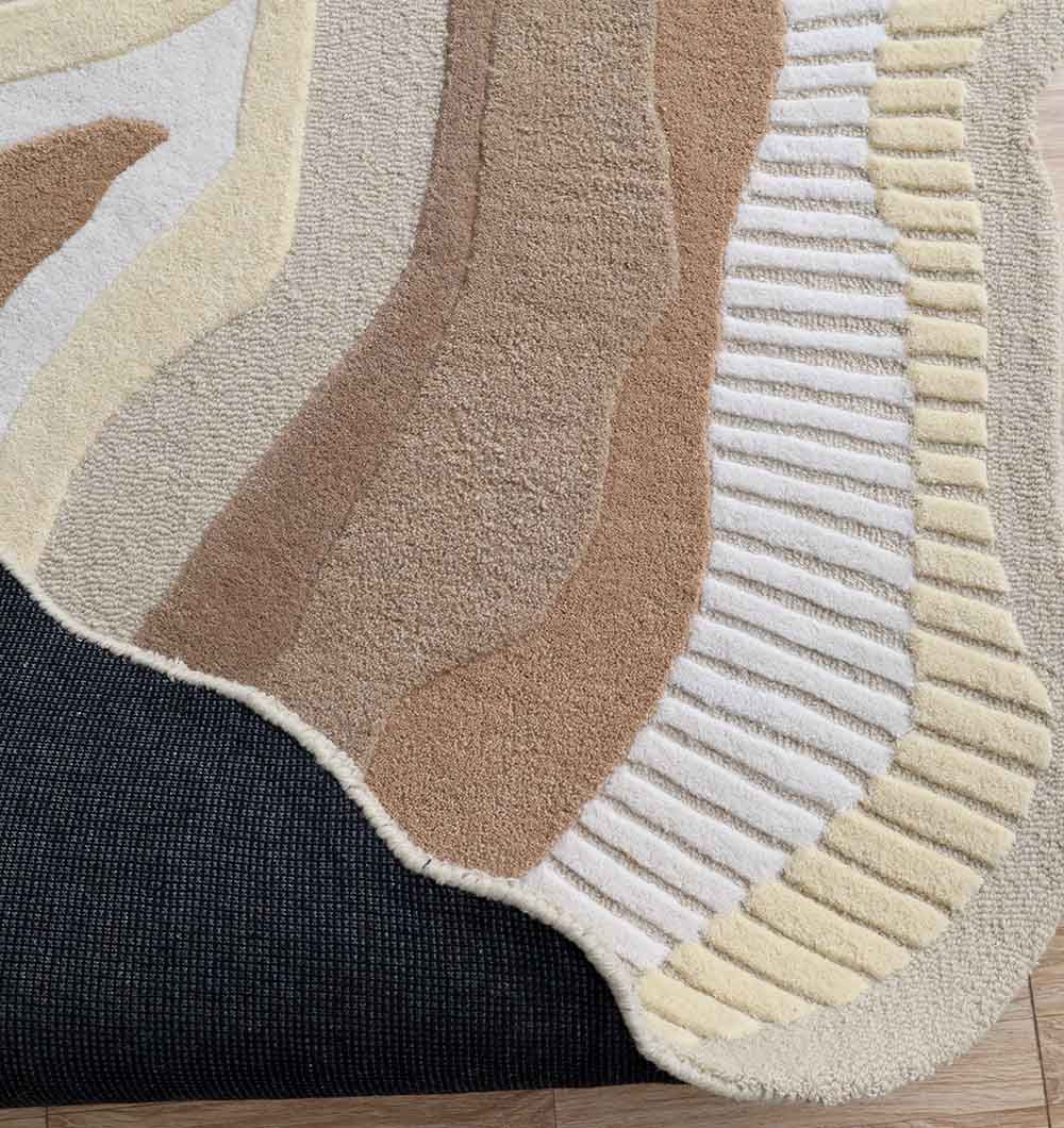 Bring warm, earthy style to your space with this beige area rug in soft sand, taupe, cream, and light brown. The layered, map-like pattern draws the eye to the center, while the wavy outline adds an artistic look. A ribbed border gives extra texture and depth, making it feel cozy underfoot without being heavy. This irregular shape rug is perfect for breaking up straight lines in modern rooms and works well under a coffee table or reading corner. Crafted as a hand tufted rug, it adds a clean, calm finish that pairs easily with wood, neutral sofas, and natural decor.