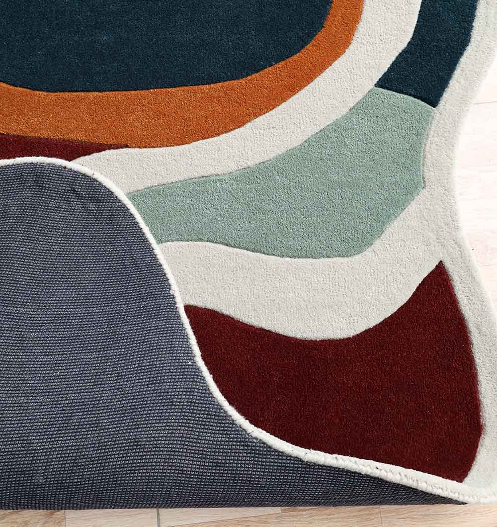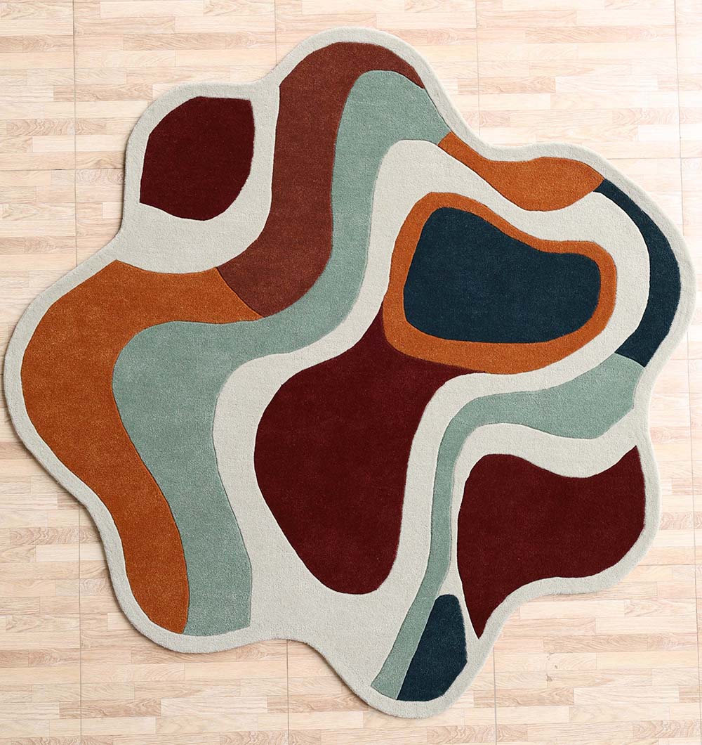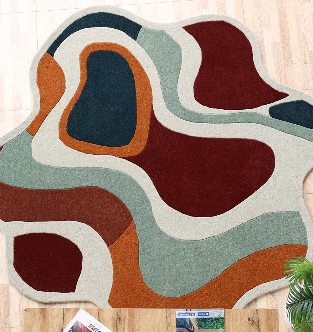 Bring soft movement and rich color to your space with this modern abstract rug in an eye-catching organic outline. Flowing bands of ivory, rust, burgundy, sage green, and deep teal create a calm, layered look that feels artistic but easy to style. This hand tufted rug has a smooth, cushioned feel underfoot, making it great for daily lounging and cozy corners. The curved pattern helps break up straight furniture lines, and the irregular shape rug adds a designer touch without feeling busy. Pair it with warm wood, neutral sofas, or simple accents for a balanced finish.