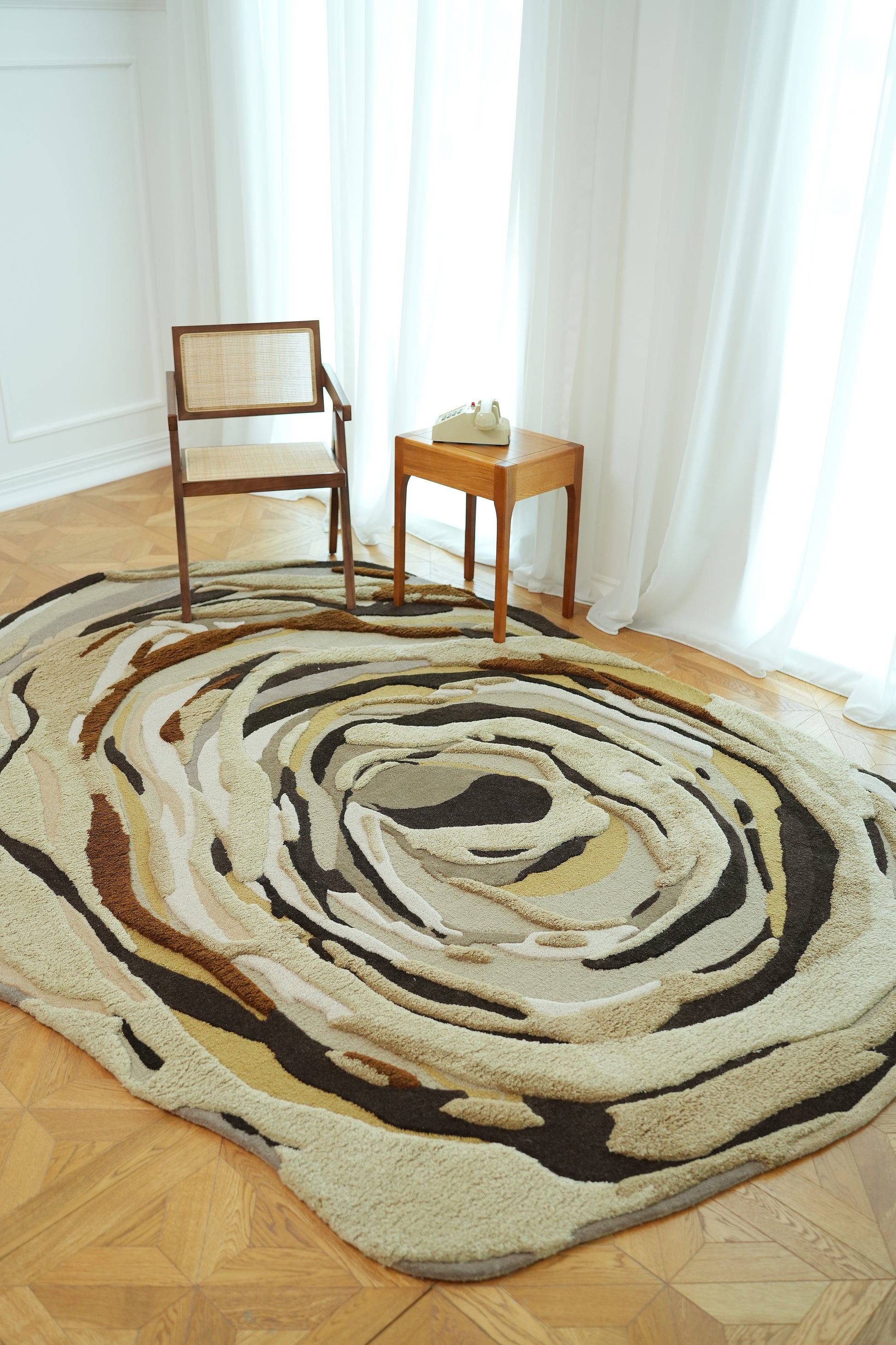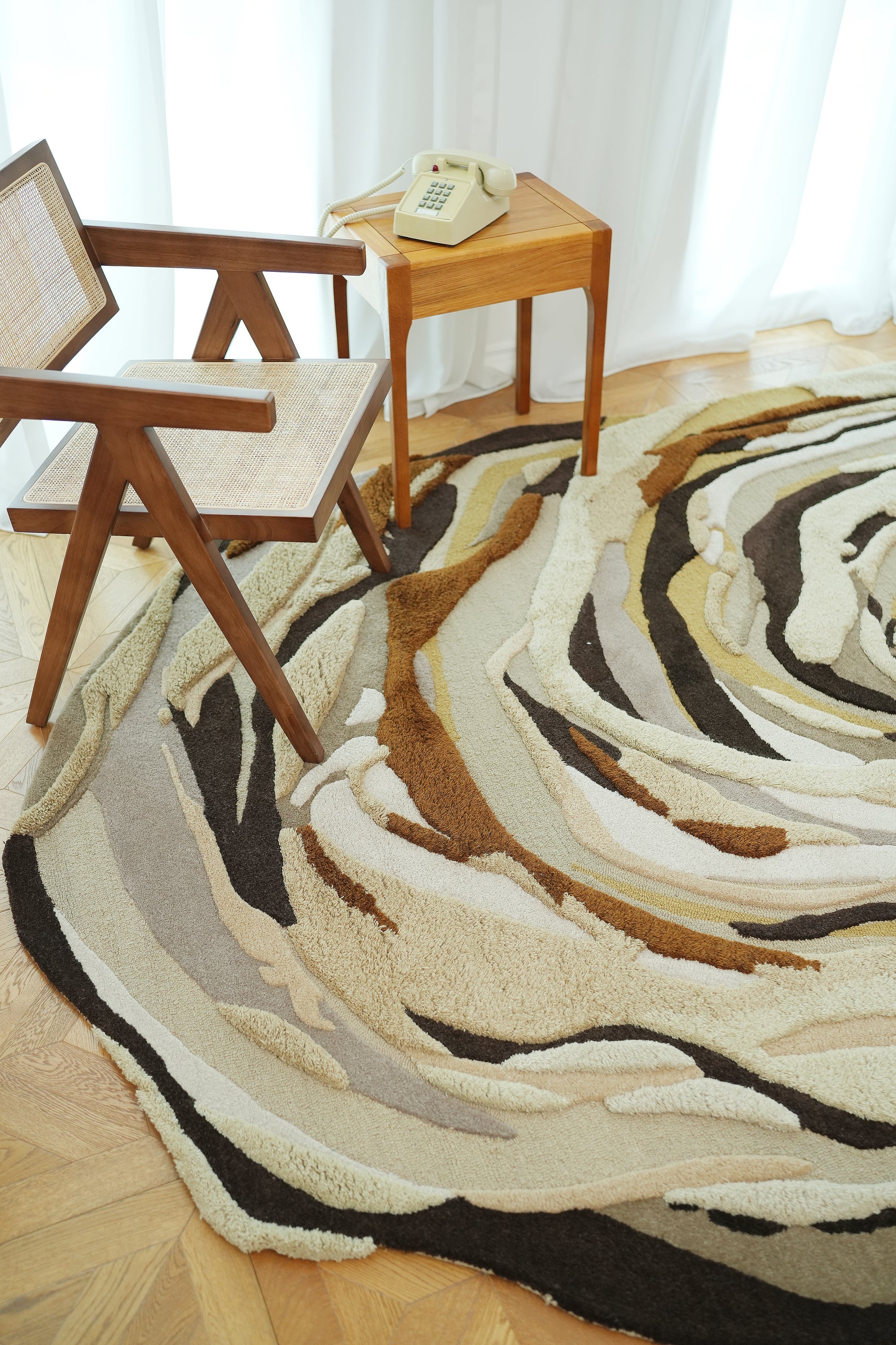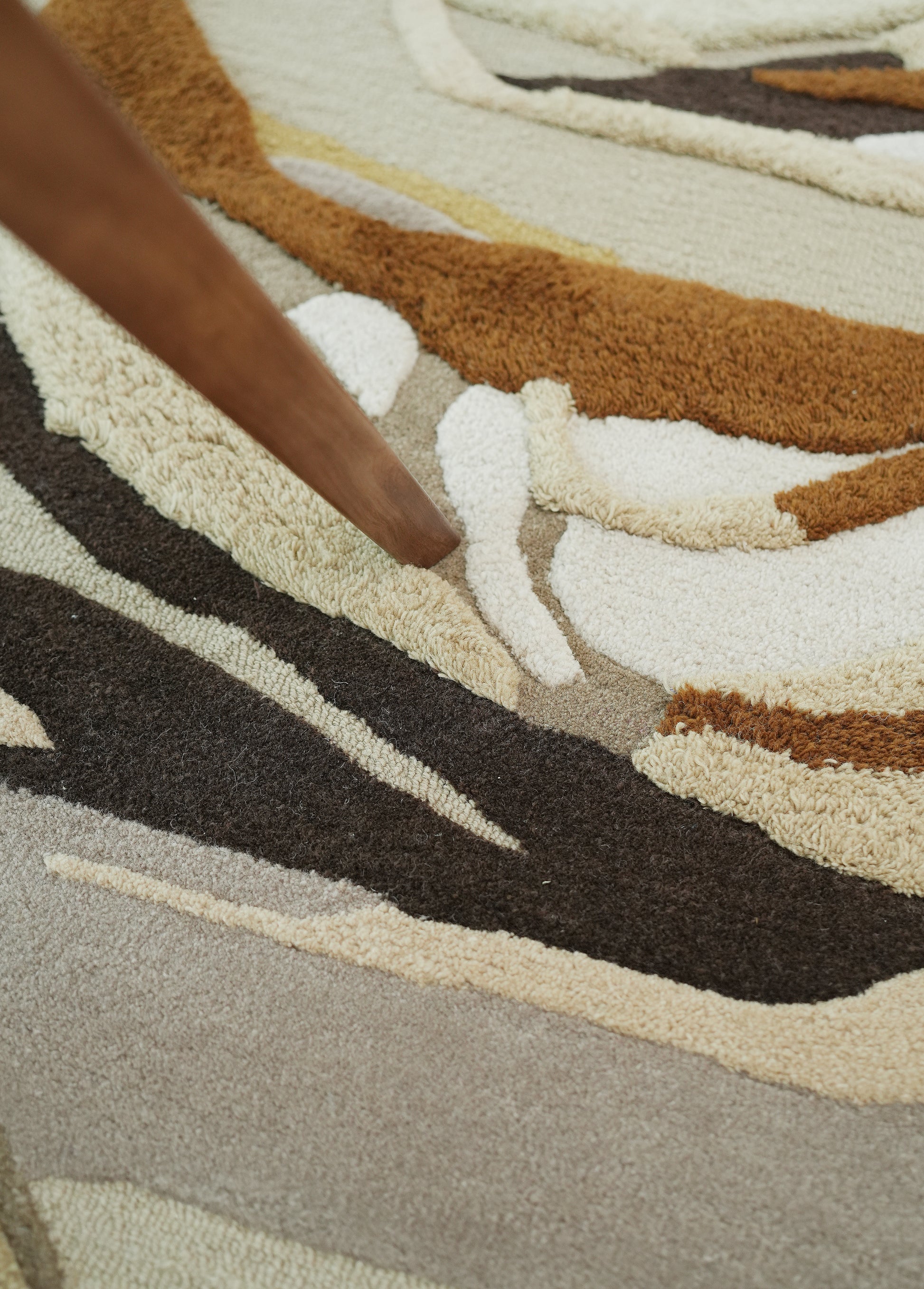 Cream, beige, and taupe tones swirl with deep chocolate and rust accents to create a bold, layered look. This abstract irregular rug feels like modern art on the floor, with carved lines that add soft texture and depth. The shape breaks up straight furniture lines and makes a cozy zone for seating. Use it as a modern neutral rug that still has movement, pairing well with wood, leather, and warm metal decor. Made as a hand tufted wool rug, it offers a plush feel that’s easy to style in everyday spaces.
