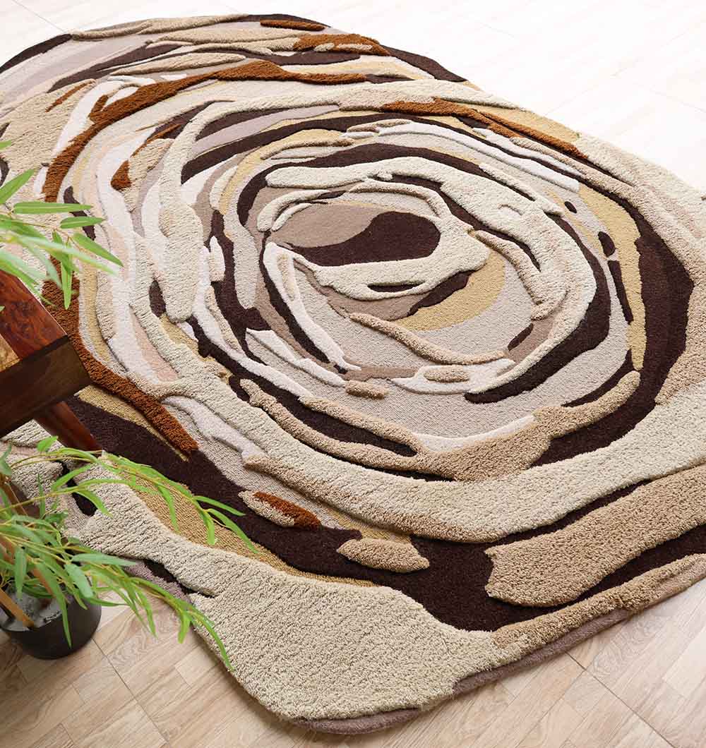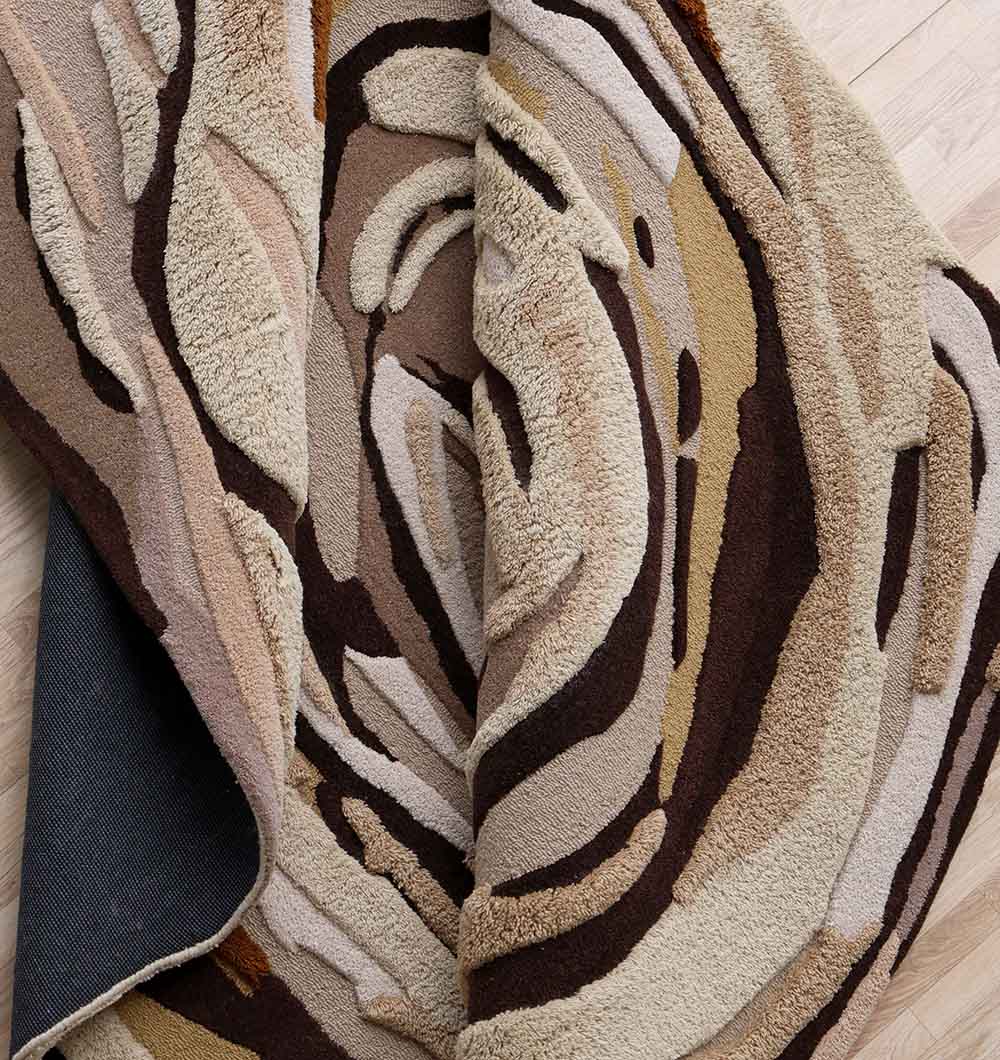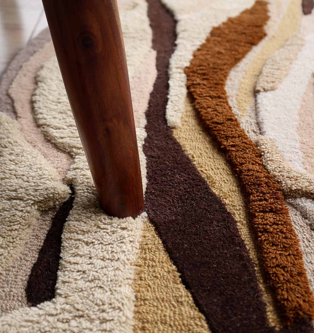 Cream, beige, and taupe tones swirl with deep chocolate and rust accents to create a bold, layered look. This abstract irregular rug feels like modern art on the floor, with carved lines that add soft texture and depth. The shape breaks up straight furniture lines and makes a cozy zone for seating. Use it as a modern neutral rug that still has movement, pairing well with wood, leather, and warm metal decor. Made as a hand tufted wool rug, it offers a plush feel that’s easy to style in everyday spaces.