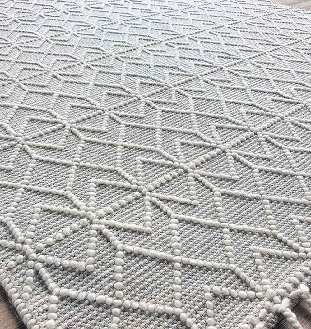 Fresh and modern, this grey and ivory rug brings soft pattern without feeling busy. The woven design mixes small geometric shapes with a calm, textured base, finished with tassels for an easy, relaxed look. Made with New Zealand wool and cotton, it feels cozy underfoot while staying light and versatile for everyday spaces. Style this grey wool rug under a sofa, bed, or desk to add warmth and balance. It also works beautifully as a textured woven rug in neutral interiors, and the pattern gives it the charm of a geometric area rug without overpowering the room.
