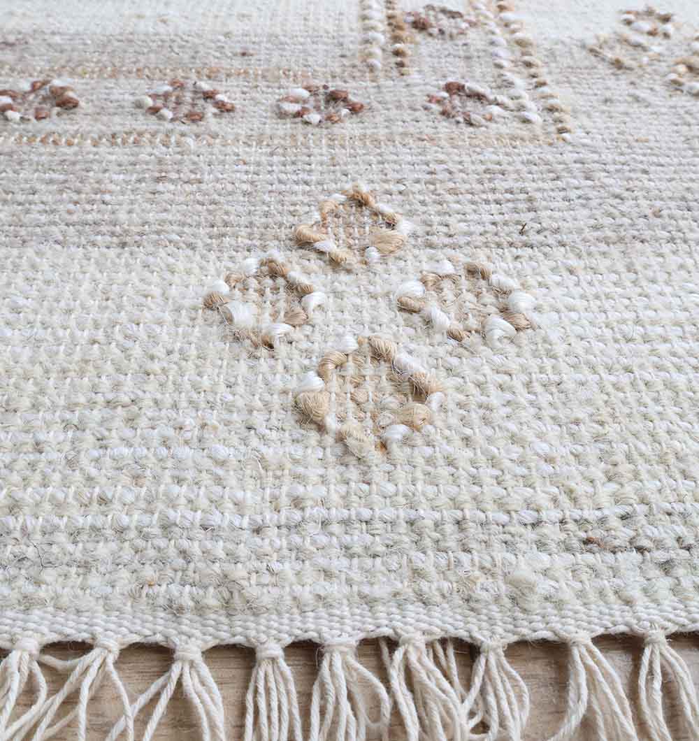 Soft ivory and light beige tones create a calm base for this rectangular design, finished with subtle striped bands and small floral motifs in warm tan and muted brown. The framed border keeps the layout balanced, while the fringe edges add a relaxed touch. Woven as a kilim rug, it features a flat, low profile that fits easily under furniture and works well in layered spaces. Made from jute and cotton, this jute kilim rug brings natural texture with a breathable, lightweight feel suited for everyday use. Choose this neutral flatweave rug to add gentle pattern and warmth while keeping the room bright and easy to style.