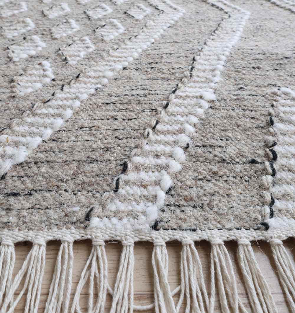 Neutral beige and ivory tones come together in this structured geometric layout, featuring raised diamond and linear motifs that add depth through texture. The soft contrast keeps the look clean and balanced, while the fringe edges give it a relaxed finish. Woven as a kilim rug, it has a flat profile that sits neatly under furniture and works well in layered spaces. Made from jute and cotton, this jute kilim rug offers natural texture with a breathable, lightweight feel suited for everyday living. Choose this geometric flatweave rug to introduce subtle pattern and dimension without strong color shifts.