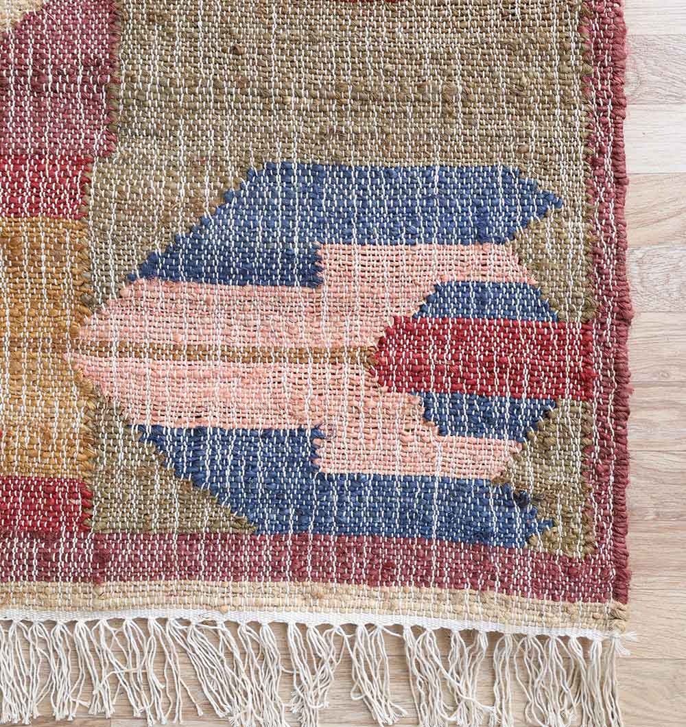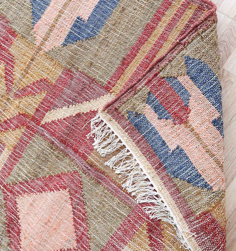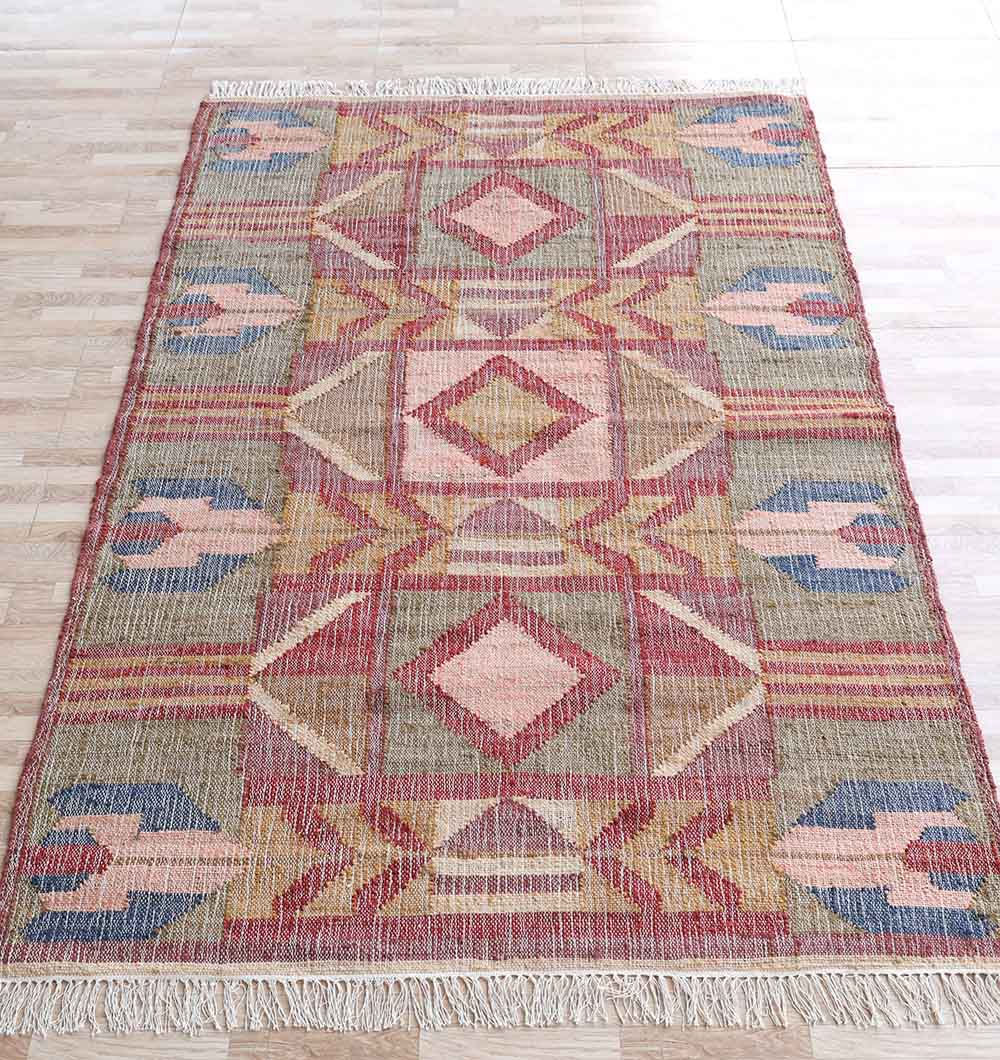 Bold geometric blocks in dusty red, muted green, soft pink, mustard, and hints of blue give this rectangular piece a lively yet balanced look. The repeated diamond shapes and side motifs create a strong tribal feel, while the faded tones keep it easy to style. Woven as a kilim rug, it features a flat surface that works well under tables and seating areas. Made from jute and cotton, this jute kilim rug adds natural texture with a breathable, lightweight feel. Fringe edges complete the relaxed finish. Choose this tribal flatweave rug to introduce color and pattern while keeping the overall space grounded.